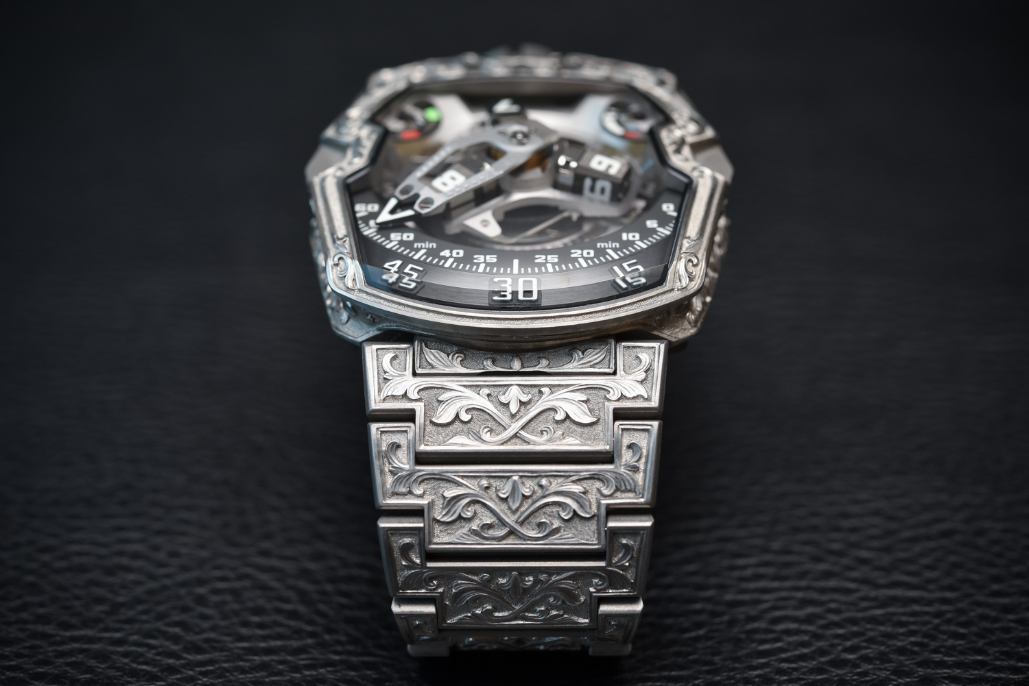 This painstaking work took Florian Güllert more than 260 hours to complete. The most surprising side of this engraving work is how it manages to merge with the sharp lines and angular shapes of the futuristic UR-210. While highly surprising at first, the URWERK UR-210 Amadeus takes another dimension when worn, being subtler and more consistent than we initially expected. This decorum makes even more sense after Martin Frei explains it to you: “we have evolved a strikingly contemporary notion of indicating the time, yet it is based on a 17th-century concept (the Baroque era). I see the UR-210 Amadeus as a continuum rather than a contradiction.” The UR-210 has come full circle…