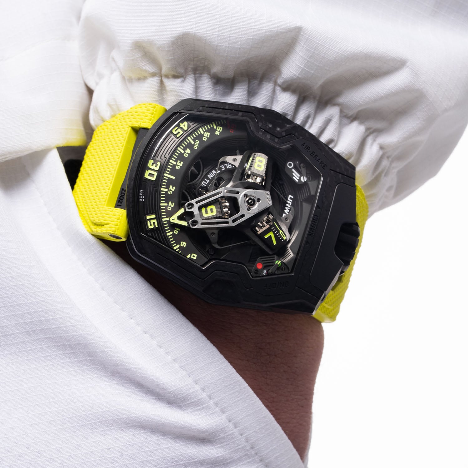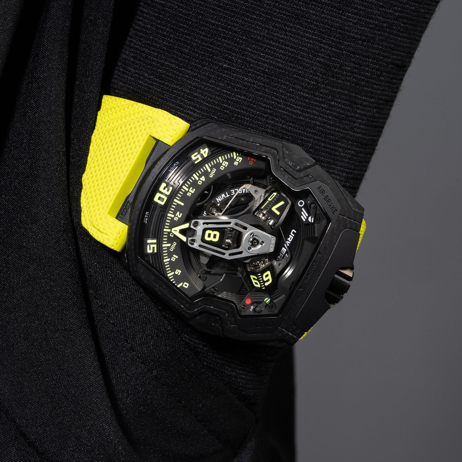 In addition to the time display, the watch also includes several complex indications. The watch integrated a self-winding movement (Vaucher base) regulated by an exclusive dual turbine system. One absorbs external shocks while the other regulates the air flow of the automatic winding mechanism, acting as a true aerodynamic brake. A control on the back allows the rotor load to be adjusted or even completely deactivated to switch to manual-winding mode. Two symmetrical indicators – at 11 o’clock and 1 o’clock – display these settings. The movement, calibre UR-7.30, is delivering 50 hours of power reserve.