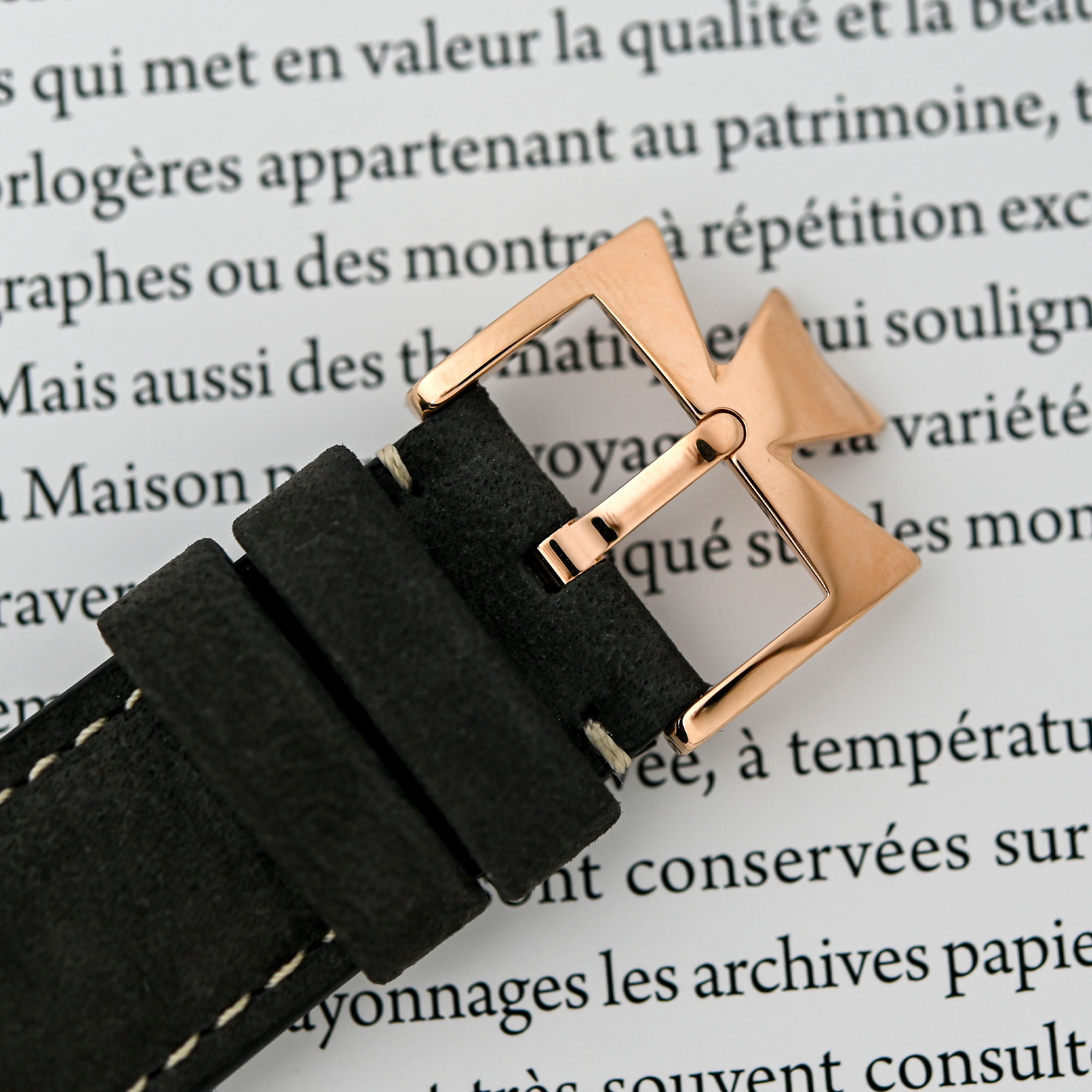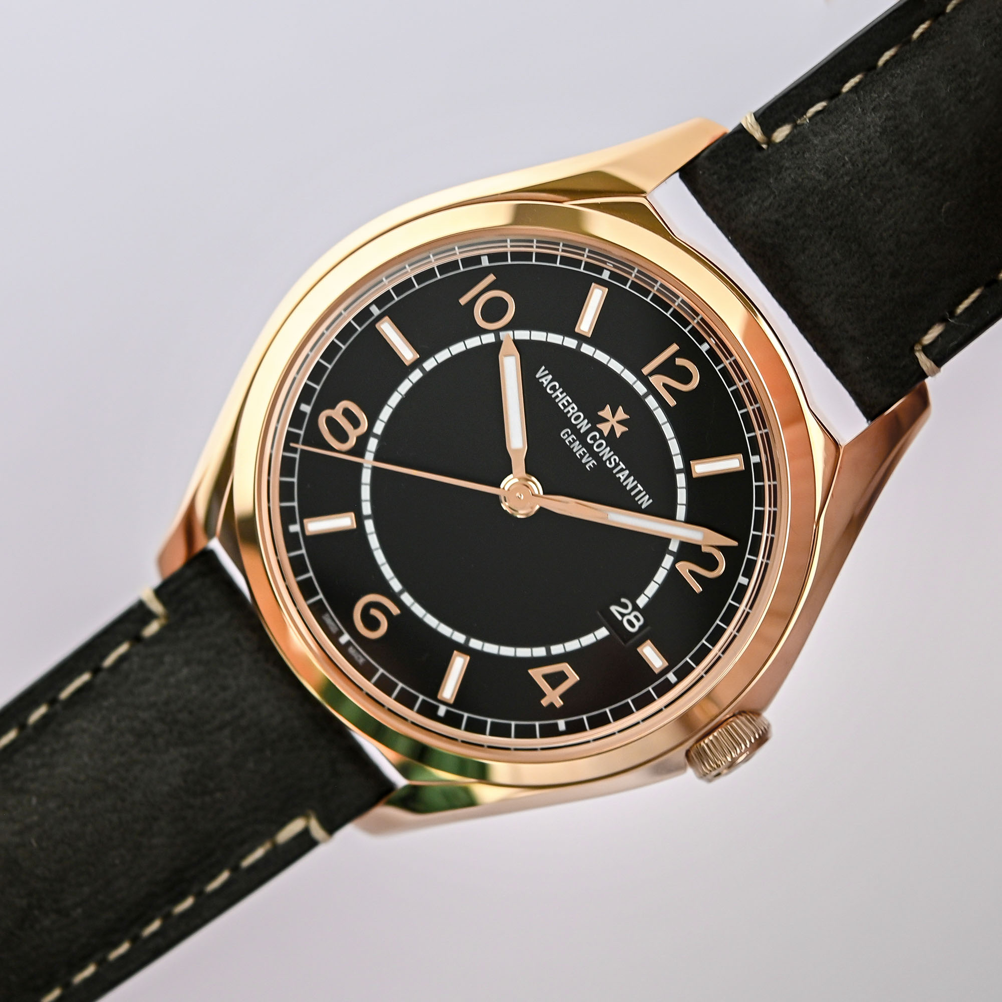The new rose gold Fiftysix Self-winding with a black dial is worn on an anthracite nubuck calfskin leather strap with calfskin lining and ecru buckle. The price is EUR 28,100. For more, visit www.vacheron-constantin.com.