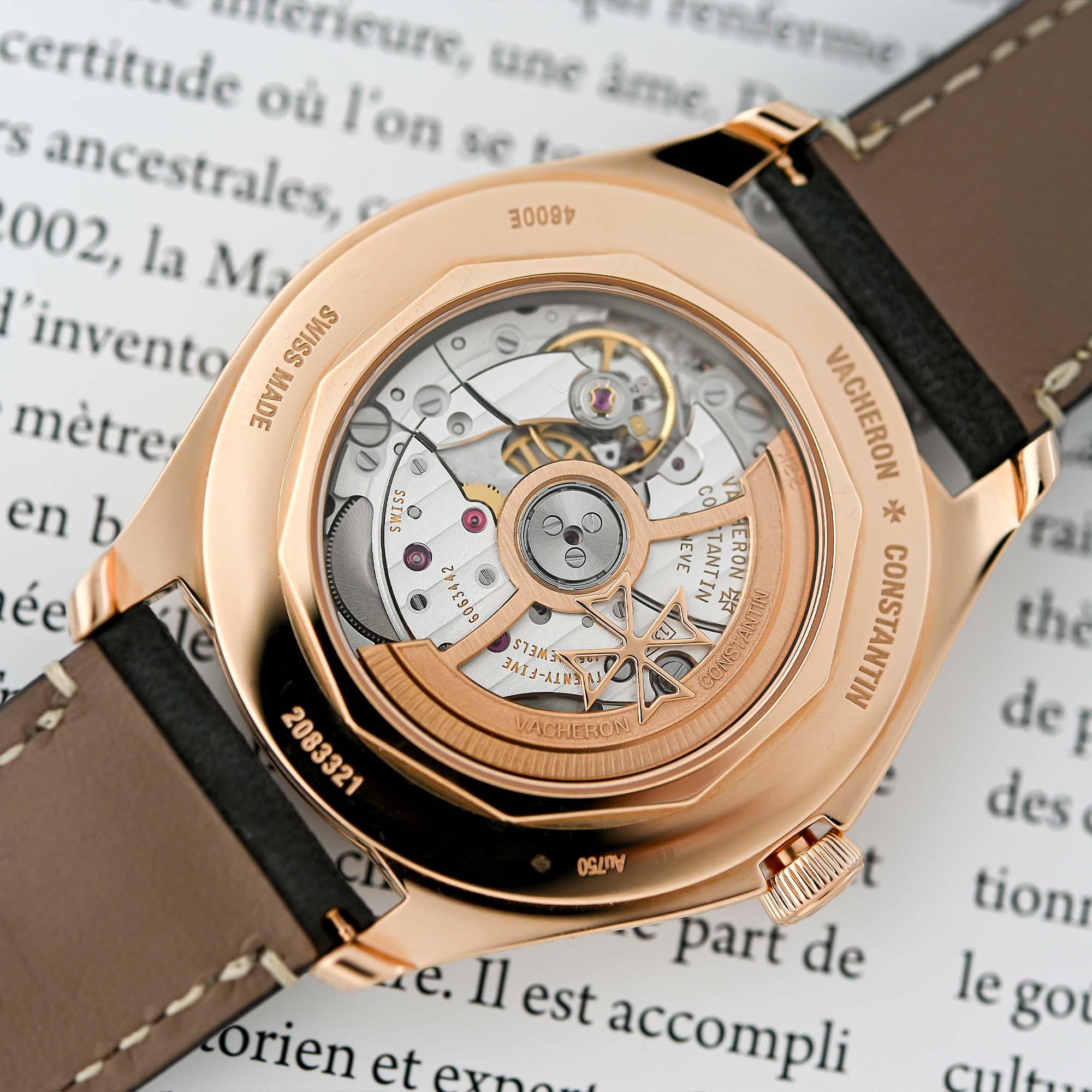 The Fiftysix Self-winding uses Vacheron’s automatic calibre 1326, visible through a display case back. The movement is based on a Cartier ébauche and produced by the Richemont Group’s movement manufacturer, Horlogère ValFleurier. It is then finished, assembled, and regulated at Vacheron Constantin workshops. The movement comprises 142 components, including 25 jewels, operates at a 28,800 vibrations/hour frequency and provides 48 hours of autonomy when fully wound. Calibre 1326 offers a quick set date, hacking seconds, and has an openworked Maltese cross-shaped pink gold oscillating weight.