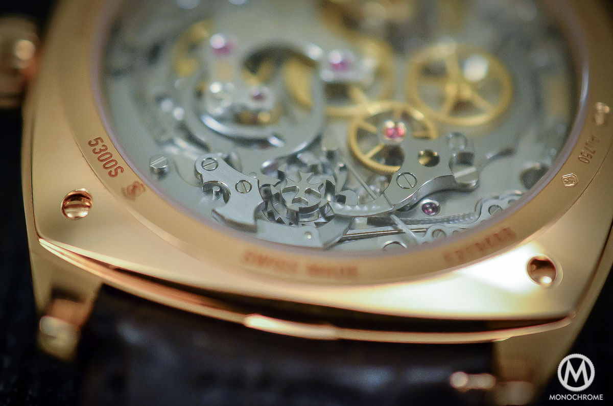 Again, as its 1928 source of inspiration, the Vacheron-Constantin Harmony Chronograph features a cushion-shaped case (here made of 18k rose gold). The lugs are fully integrated in the casebands without any discontinuance, creating a smooth profile but also a rather bulky shape. Considering that the watch measures 42 mm x 52 mm, 12.81 mm, a bit of thinness (or a separation between the case and the lugs) would have been pleasant, in order to lighten the case. However, the Harmony remains an elegant and classy chronograph that will be perfectly usable with dressy attires – a feeling that the monopusher constructions emphasizes.