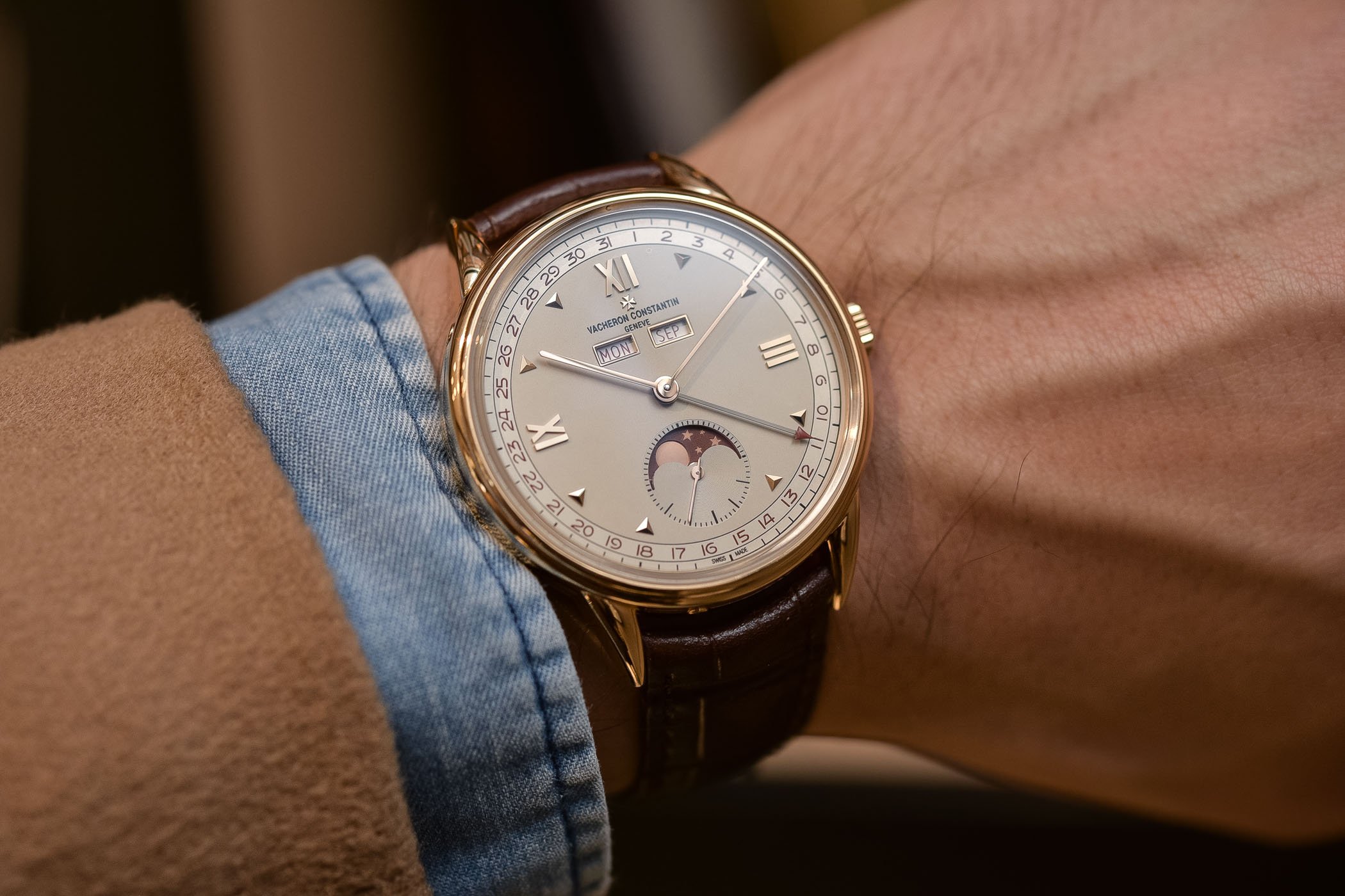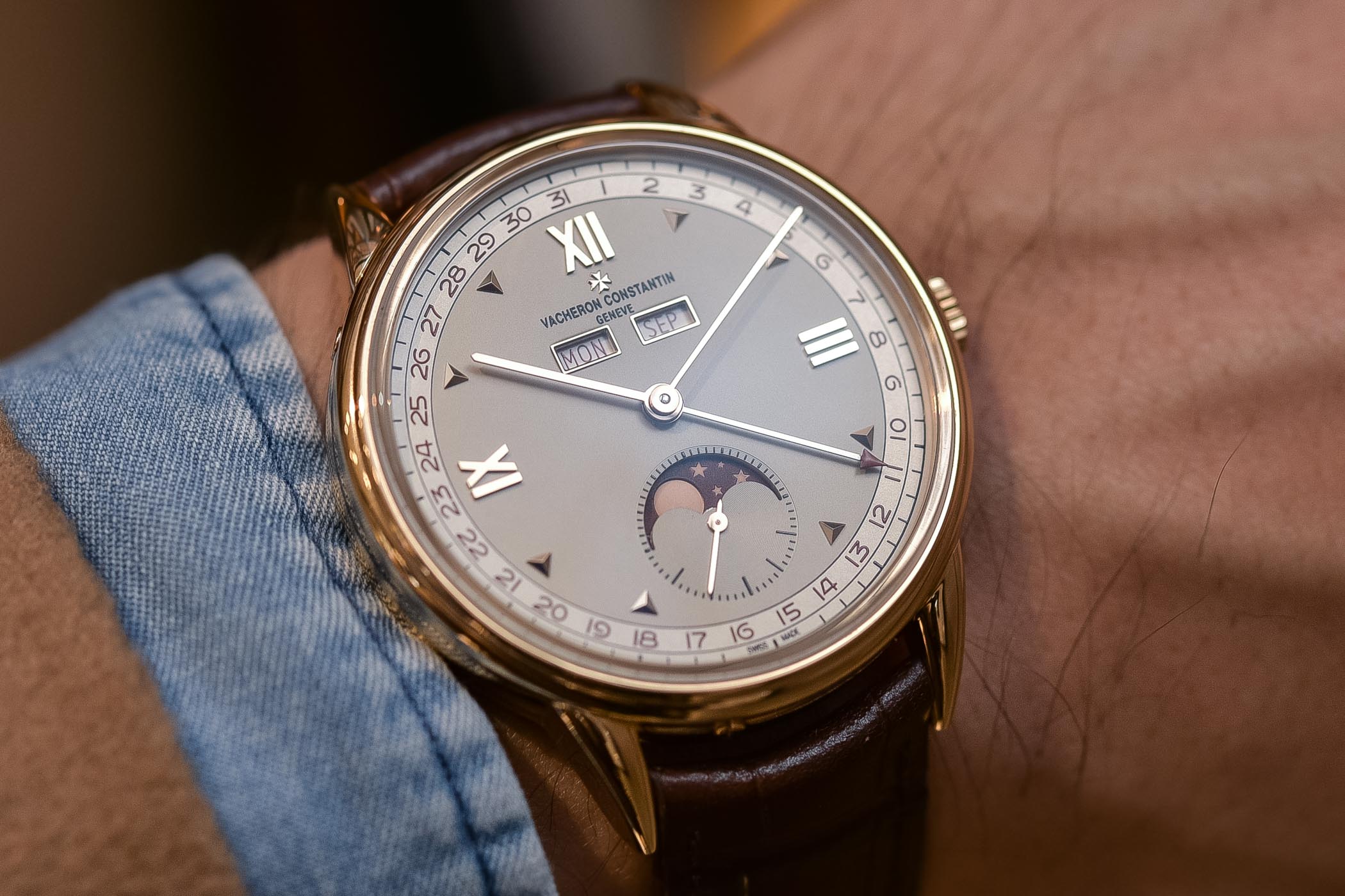 The main talking point, of course, is the complete calendar display, replete with the moon phase indicator at six o’clock. The date is shown around the periphery of the main dial and indicated via a red-tipped pointer hand. The day of the week and the month are shown through the twin apertures at 10 and 2 o’clock respectively. I particularly like how these windows have been framed by gold. It’s a subtle touch but again it adds that sense of elegance and formality to the aesthetic and shows that Vacheron has taken a little creative license with the original 4240L design. Completing the look is the moon phase display, shown through an aperture in the sub-dial at 6 o’clock.