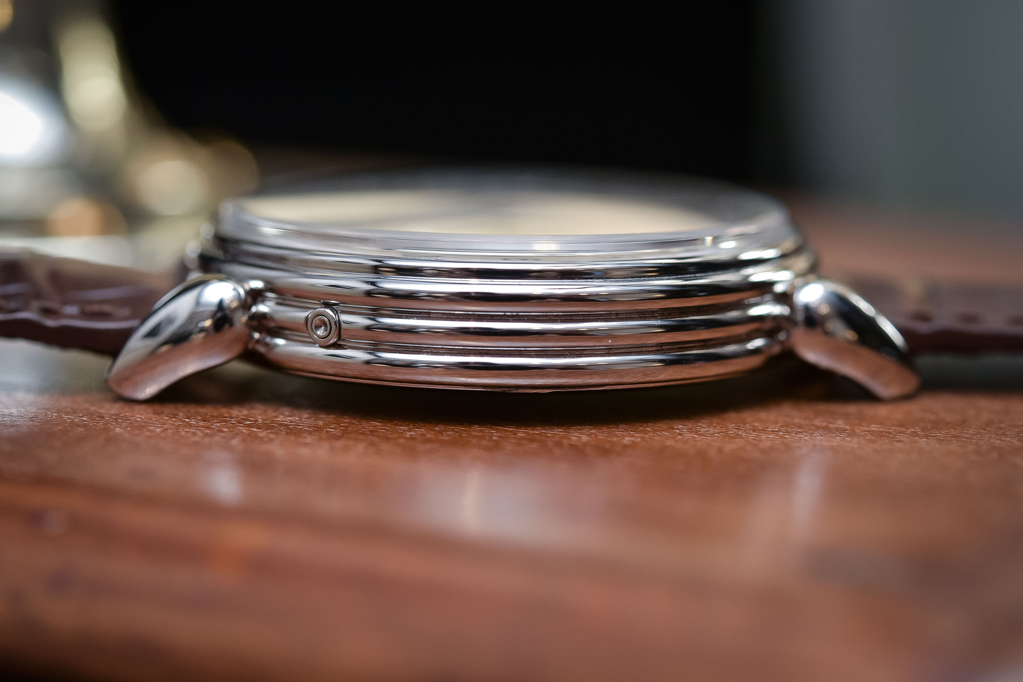 In details, the case is a perfectly round barrel of 40mm – quite a step forward compared to the 35mm vintage 4240, but still a reasonable size to meet modern standards. This case is very complex in shape, especially on the sides. The profile has been designed accordingly to the ref. 4240, with a “triple gadroon” style, combined with a stepped bezel and a raised sapphire crystal. The profile is complex and voluntarily loaded, and on the other hand, when viewed from a perpendicular angle, the Triple Calendrier 1942 feels relatively simple. This succession of convex lines gives all its originality to the watch, yet with a certain discretion. The case is entirely polished, and knowing the complexity of the profile, it is even more surprising to see it in a common material.