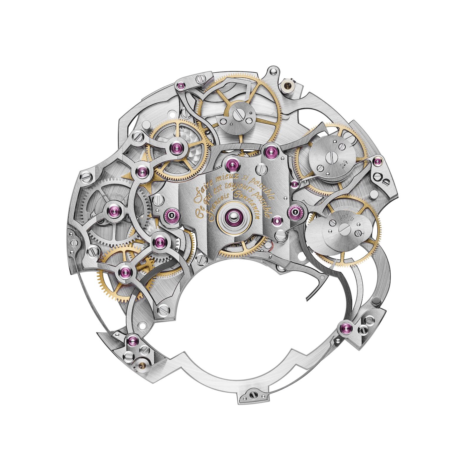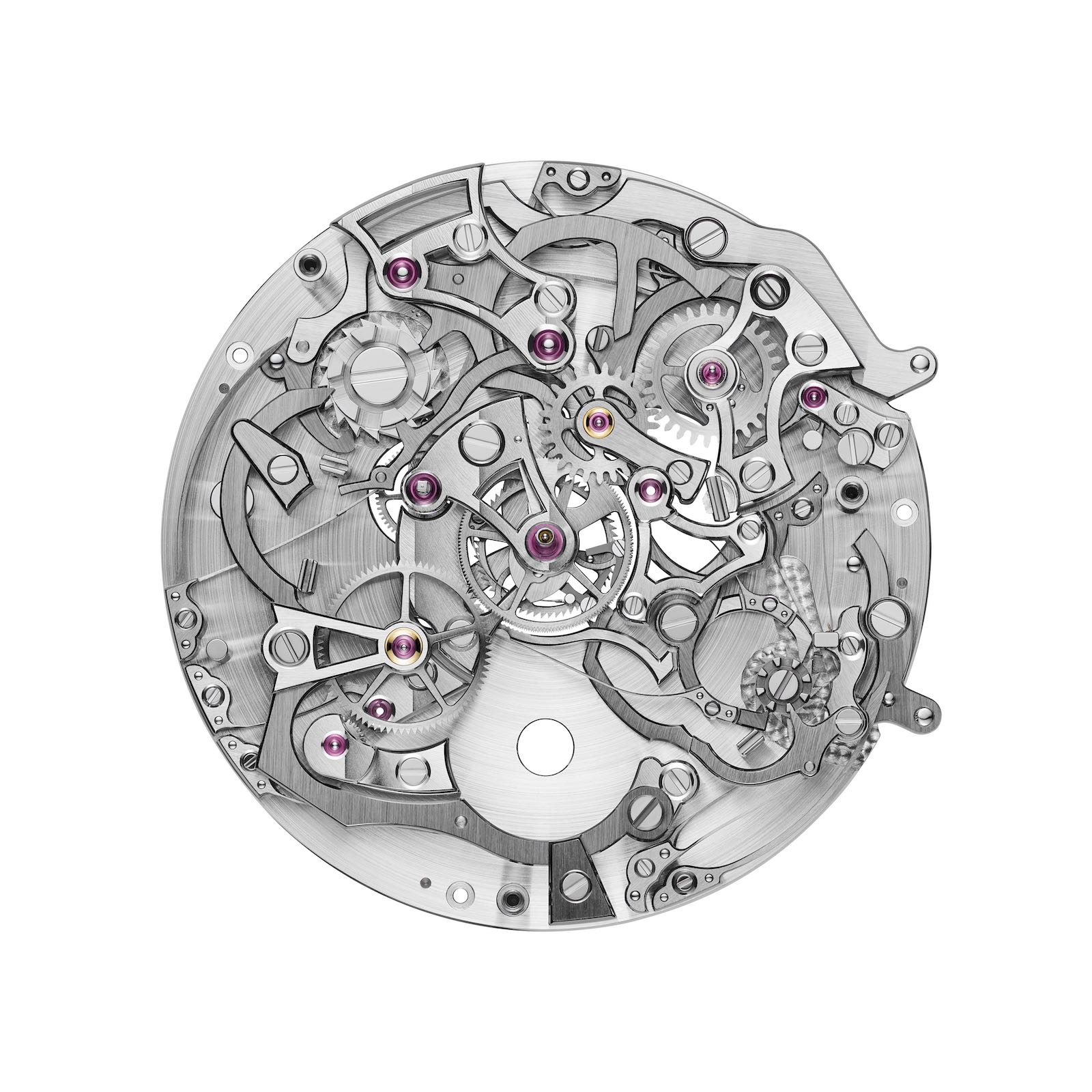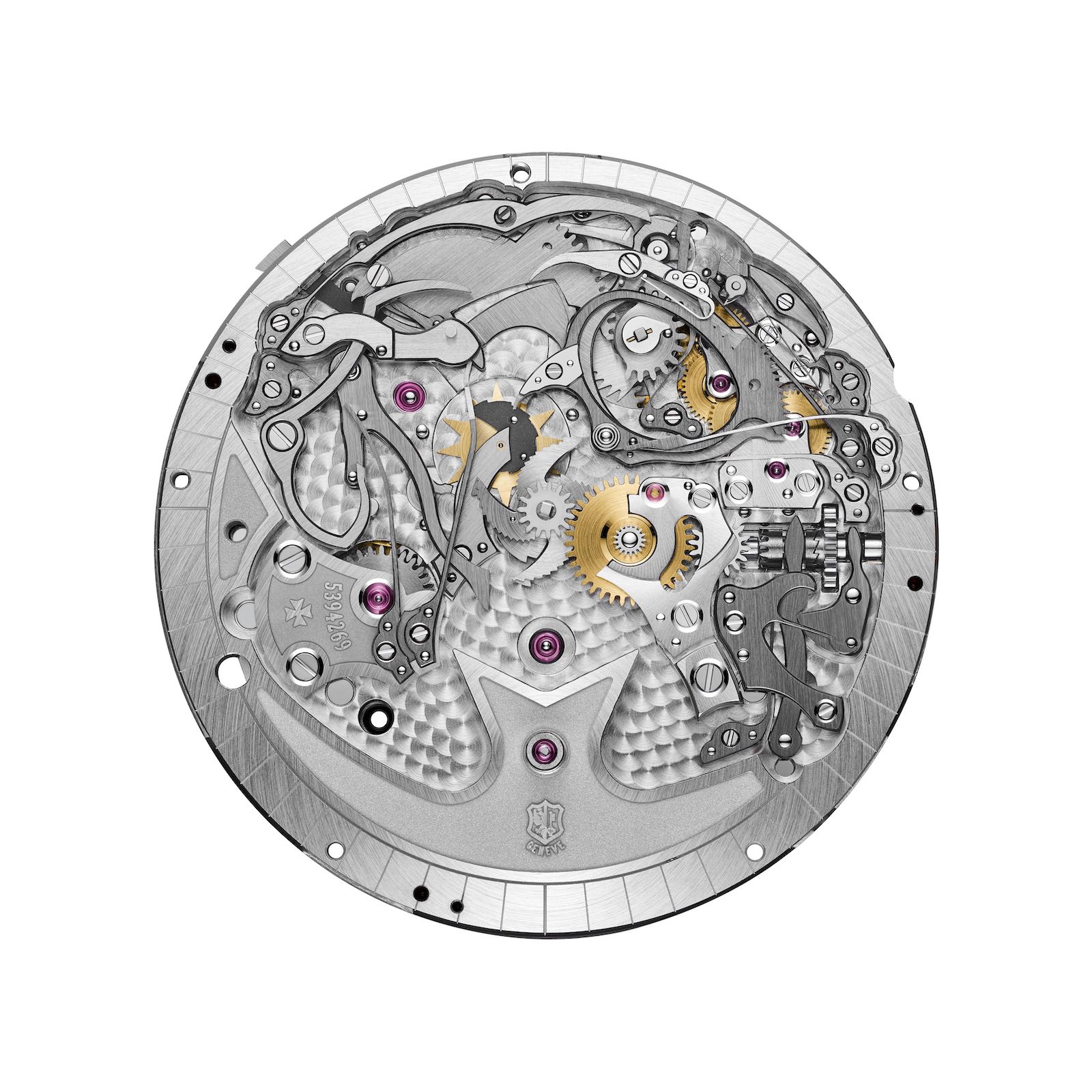 The watch is double-sided, featuring two slate grey dials with sunray and guilloché finishes around the circumference. The front face displays the time, chronograph functions and a perpetual calendar. The back is dedicated to astronomical functions, including indications of solar time, equation of time, sunrise and sunset, day and night duration, as well as the age and phase of the Moon (that requires only one correction every 1,000 years). It is also fitted with a minute repeater. Last, it is regulated by a tourbillon whose cage is shaped like a Maltese Cross, the emblem of the Maison. Running at 18,000vph, its power reserve is of 65 hours (and 40 hours when the chronograph is engaged).
