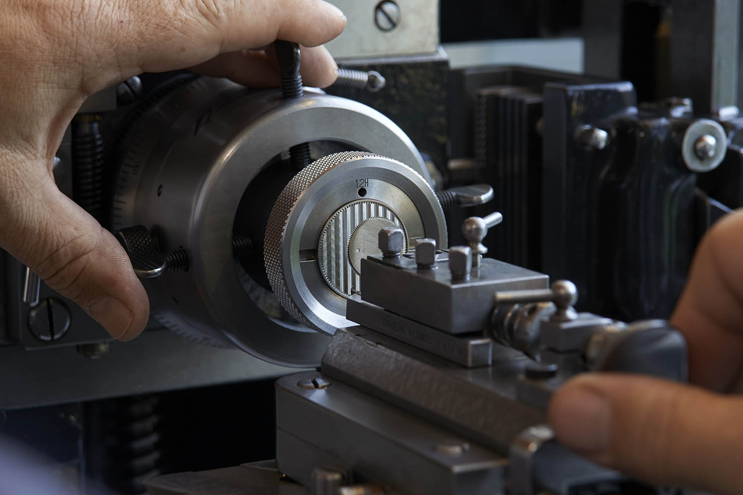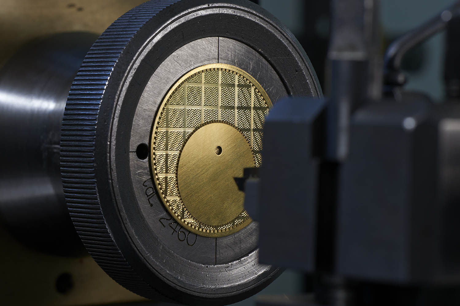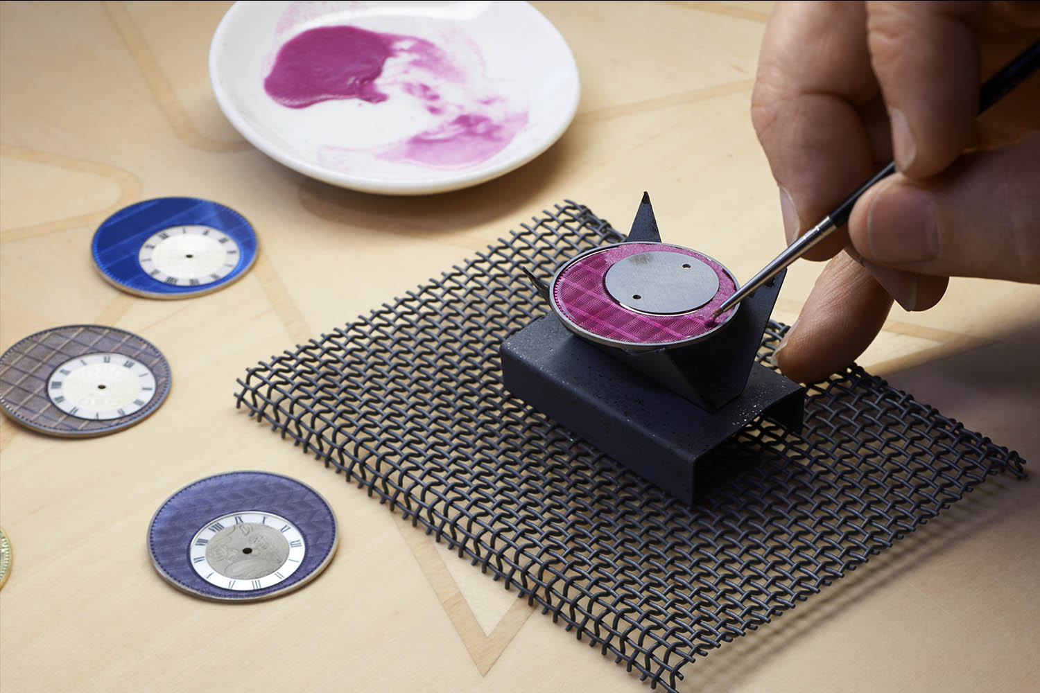 These dials, resembling finely woven cloth in accordance with the sartorial spirit, manually recreate the structure of the fabrics. By incising tiny grooves in thin gold plates, using the complex process of guilloché, the woven motif is first created. This process, already difficult to achieve because driven by hand, is even enhanced by applying a translucent enamel on the textured surface, revealing a rich colour and letting the guillochage appear underneath. Several layers of enamel and oven steps are used to reveal a unique shine and the required transparency.