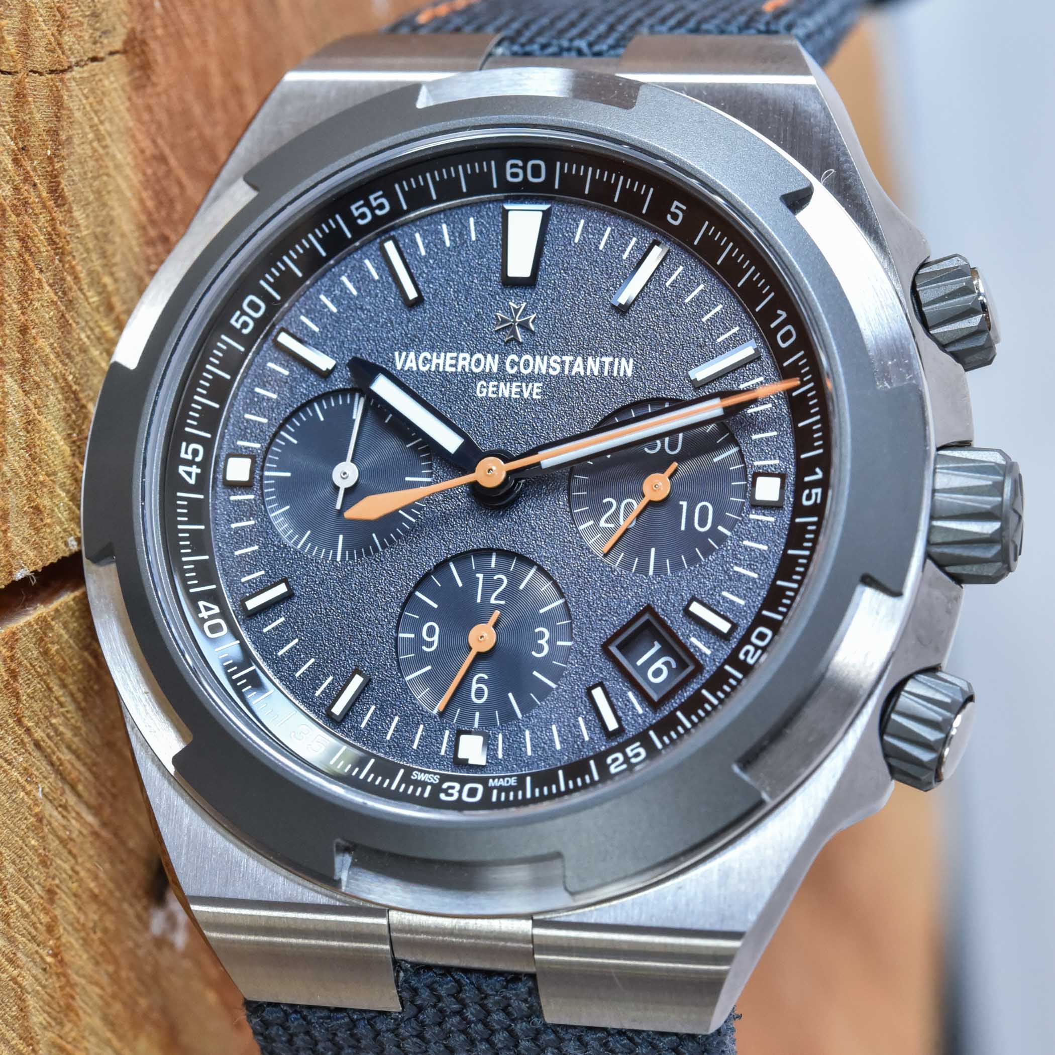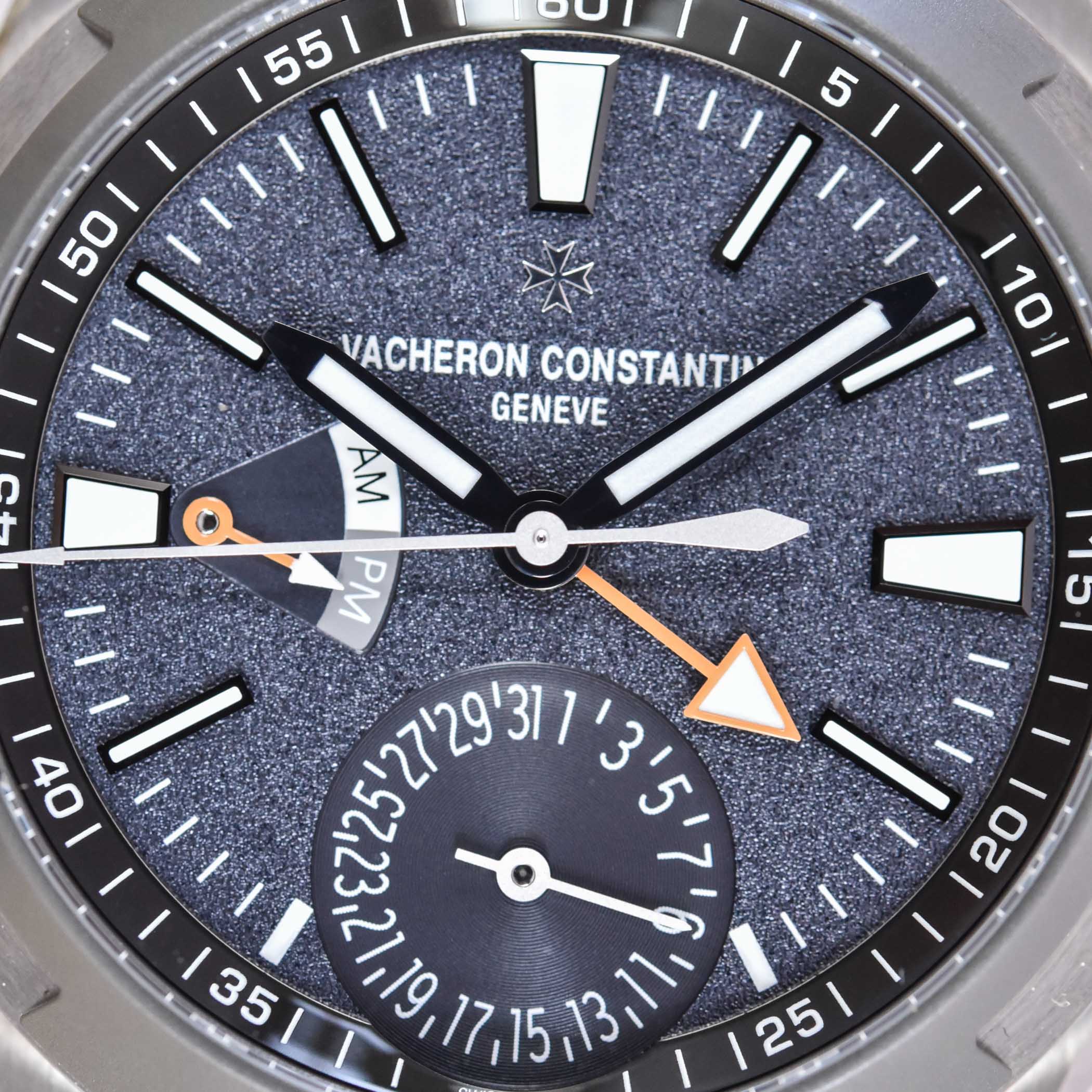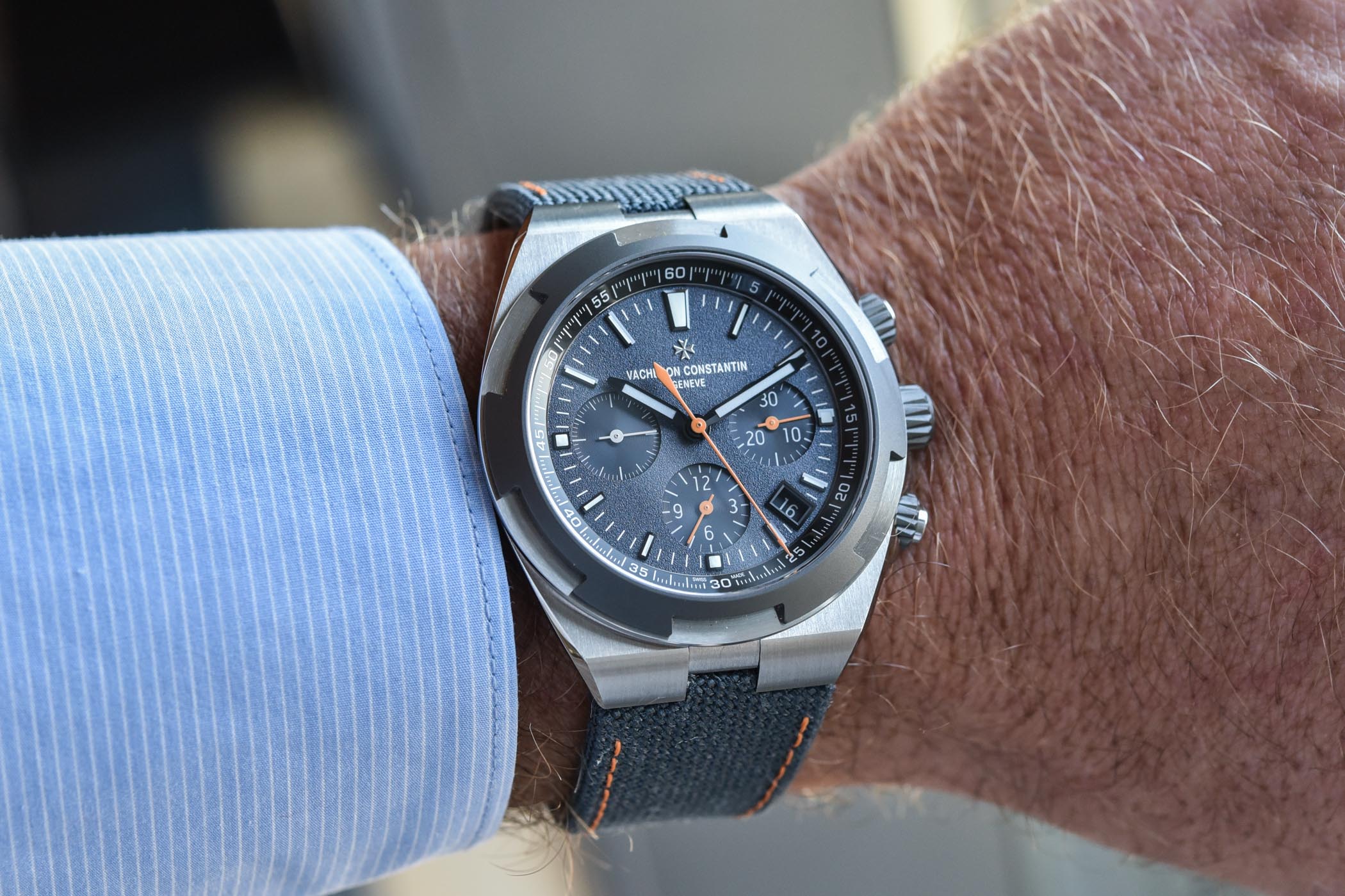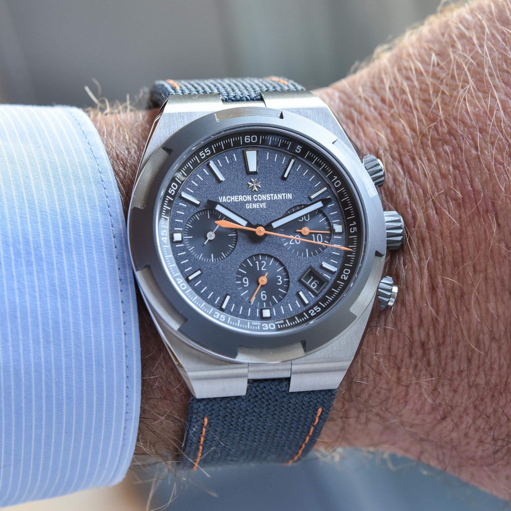 The dial is also entirely new and inspired by the watch created for Cory Richards. Gone are the refined and smooth dials found on the classic Vacheron Constantin Overseas. For these Everest Limited Editions, VC is bringing something rough and original, with a grey-blue colour and a strong grained pattern that isn’t only anti-reflective but also rather attractive and playful in the metal. This toned-down colour is combined with bright orange accents on the hands and the straps.