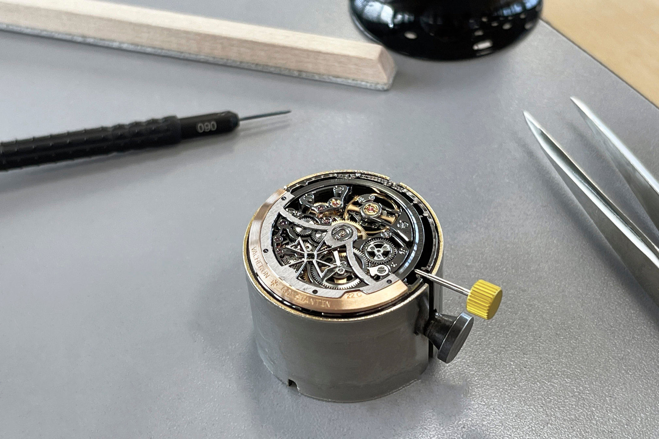 Vacheron Constantin manages to combine this with the art of skeletonization, as the Overseas QP Ultra-Thin Skeleton lacks a traditional dial. The previous version had a movement that had a grey tone resulting from the NAC treatment of the bridges, plates and other components. This is now changed to a regal blue for the various subdials and tracks, set against the gold and grey-toned components underneath. All this splendour is sandwiched between two sapphire crystals, with the signature serrated bezel on top.
