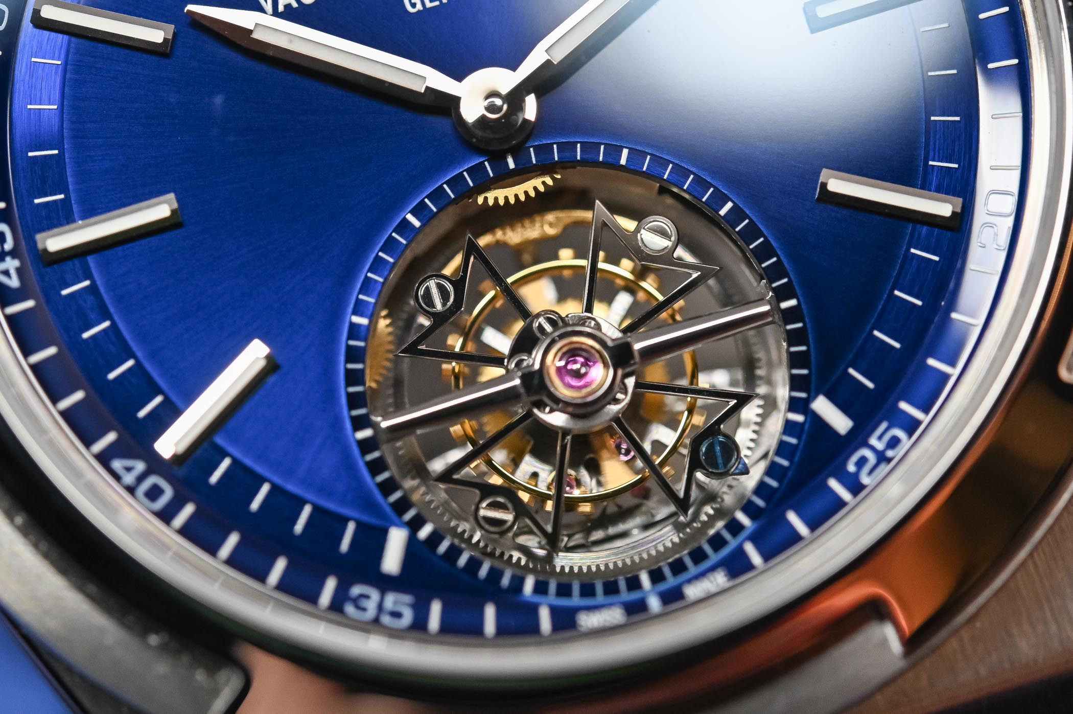 A large hole cut into the bottom half of the dial hosts the tourbillon regulator and its distinctive open carriage, shaped like a Maltese cross. One of the most mesmerising shows in watchmaking, the tourbillon is one of the top complications demanded today. Seeing a tourbillon twirling inside a steel sports watch might be shocking to some, but the relatively sober, uncluttered dial really lets it shine. The finishes are, as expected from VC, delicate and the central tourbillon bridge, held in place by a solid gold chaton, is black polished by hand to achieve its mirror-like surface and reflections; a difficult task to perform on a rounded (and such a small) surface that takes 12 hours. The tourbillon cage has also been black polished by hand – in this case on a flat surface – and all the internal parts have been manually bevelled as well.