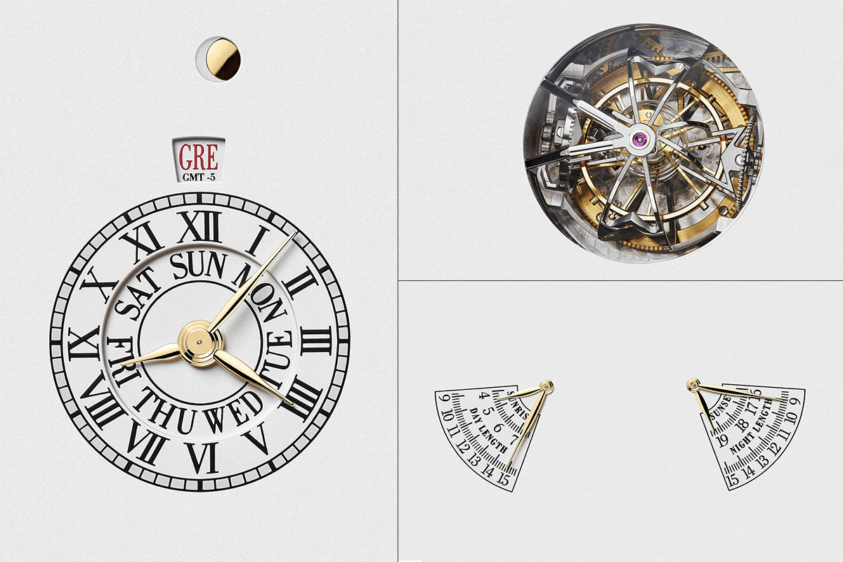 Last but not least, flanking the tourbillon aperture, are two dual sectors for the time of sunrise and day length and time of sunset and night length in the user’s home city, New York.