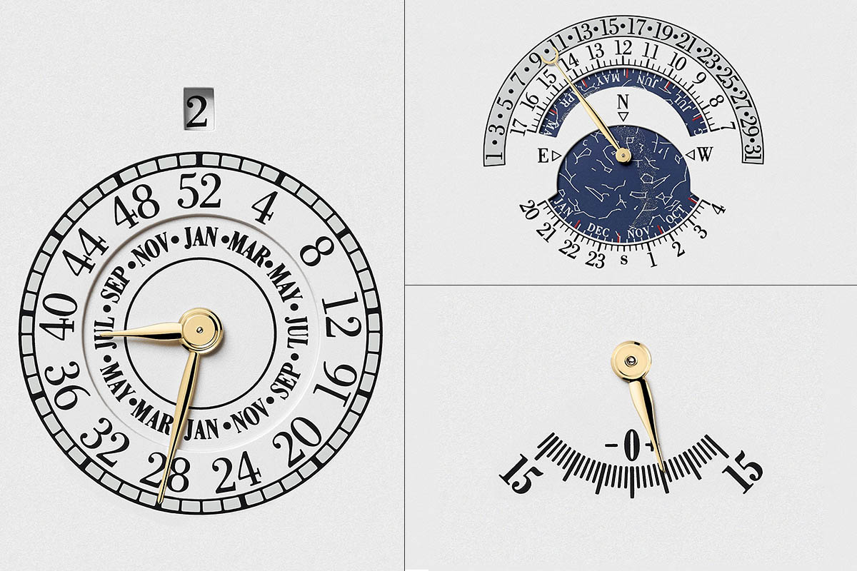 On the upper half of the dial is a sky chart depicting the night sky and star constellations visible from New York, the owner’s home town. Concentric around the sky chart is the retrograde date of the perpetual (Gregorian) calendar, displayed over a 180-degree arc with a grey background.