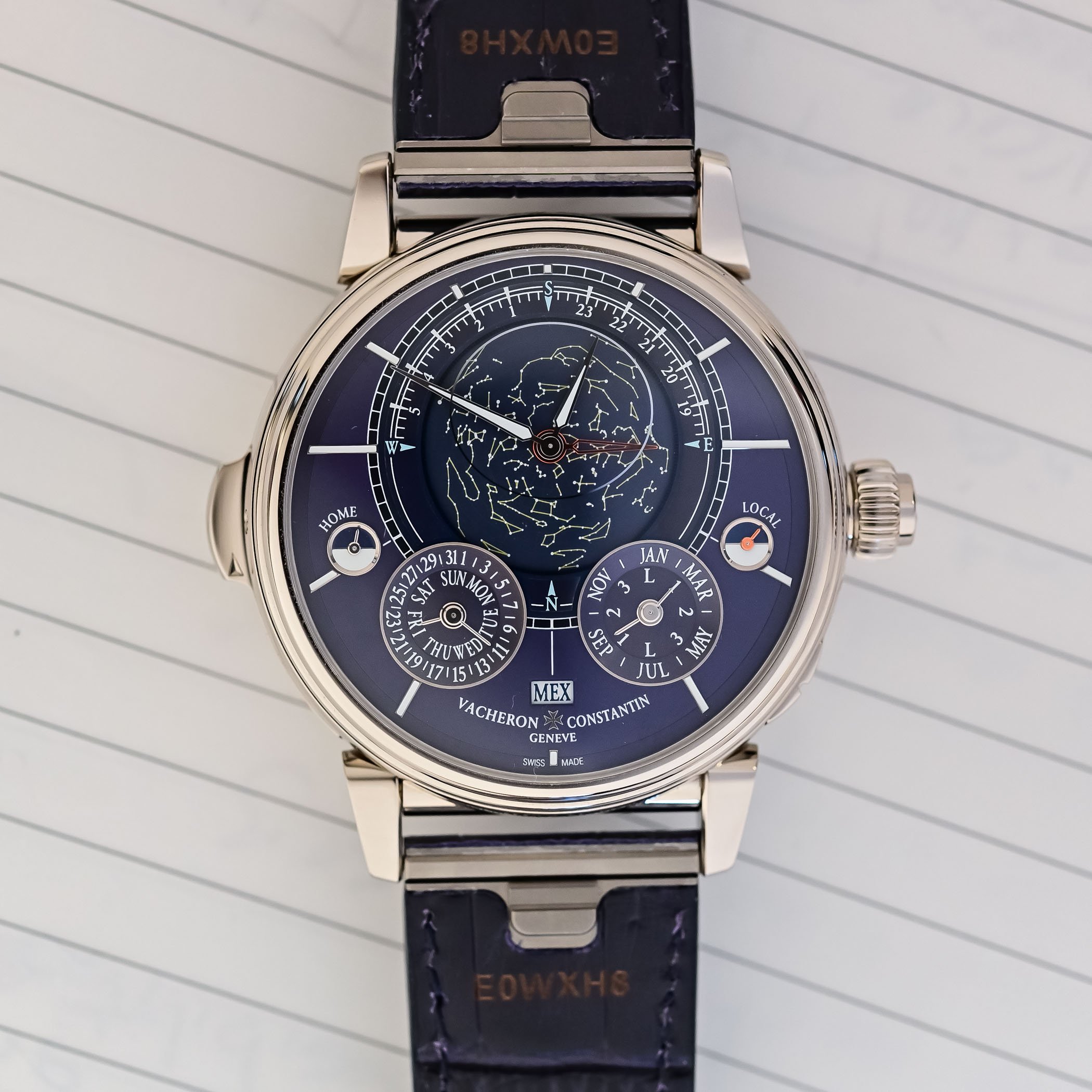 Quick facts: 47mm x 20.2mm white gold, reversible case – closed blue opaline dial with off-centred hours and minutes, Northern Hemisphere chart with sidereal time, perpetual calendar, GMT, day/night indicators for home and local time, city aperture – openworked dial with tourbillon, minute repeater, solar time, equation of time, sunrise/sunset, retrograde moon phase, power reserve indication – calibre 2756-B1, in-house, manual-winding – 1,003 components, 112 jewels – 2.5Hz – 60h power reserve – 24 complications, Hallmark of Geneva – blue alligator strap with white gold folding clasp – unique piece – ref. 9780C/000G-087C – price upon request