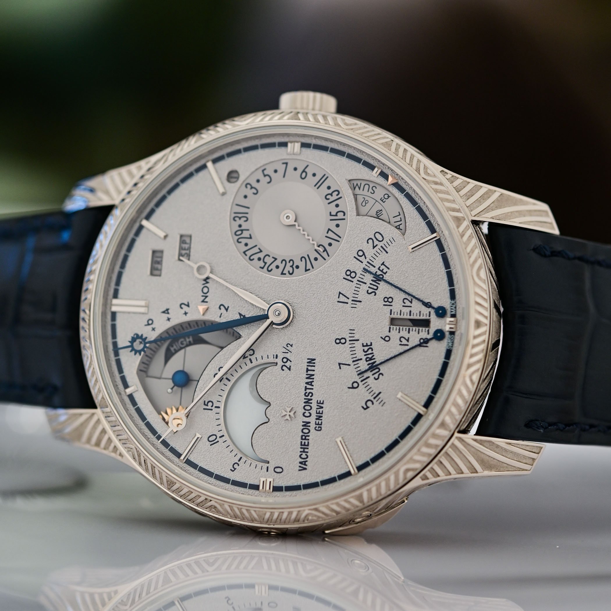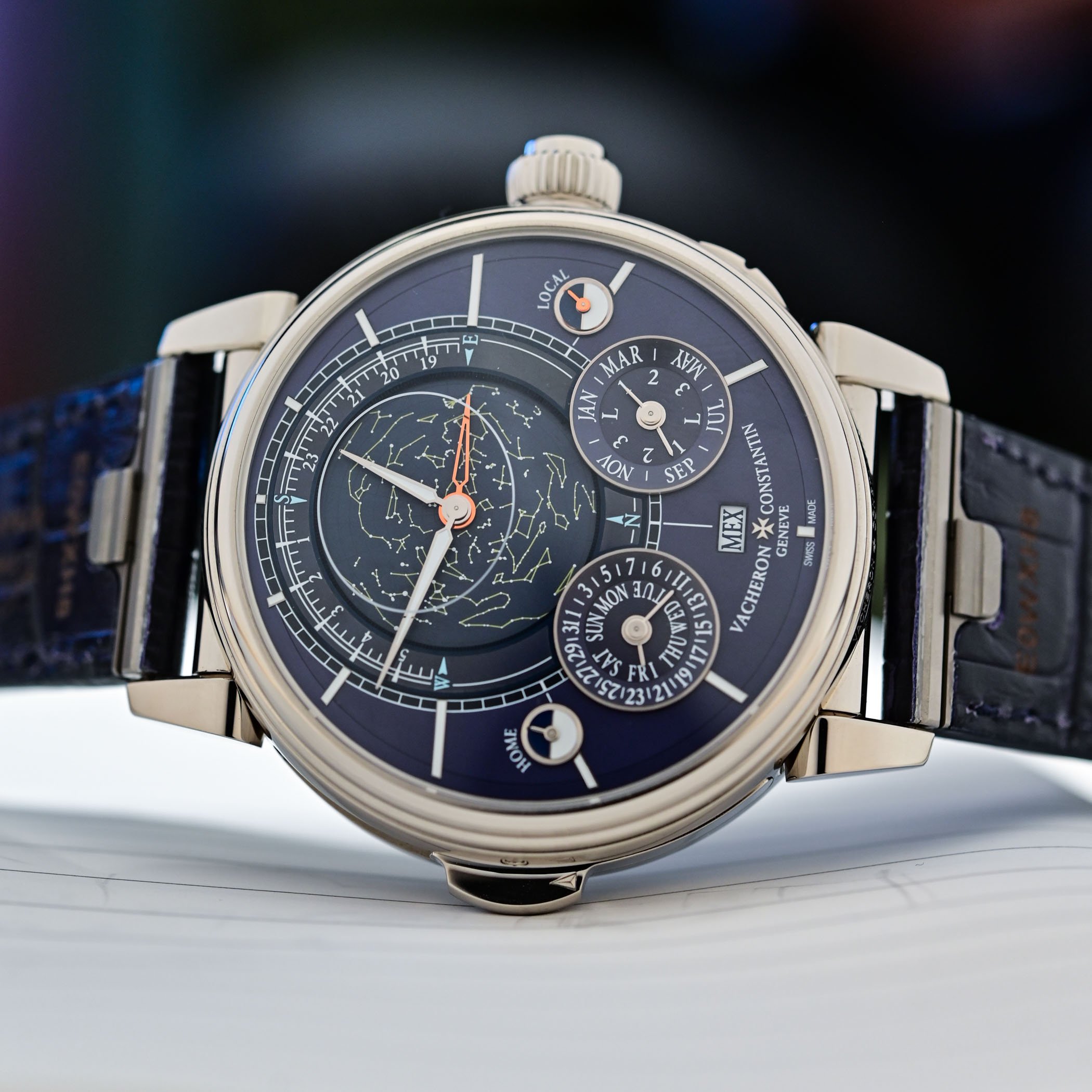 Quick facts: 47mm x 20.2mm white gold, reversible case – closed blue opaline dial with off-centred hours and minutes, Northern Hemisphere chart with sidereal time, perpetual calendar, GMT, day/night indicators for home and local time, city aperture – openworked dial with tourbillon, minute repeater, solar time, equation of time, sunrise/sunset, retrograde moon phase, power reserve indication – calibre 2756-B1, in-house, manual-winding – 1,003 components, 112 jewels – 2.5Hz – 60h power reserve – 24 complications, Hallmark of Geneva – blue alligator strap with white gold folding clasp – unique piece – ref. 9780C/000G-087C – price upon request