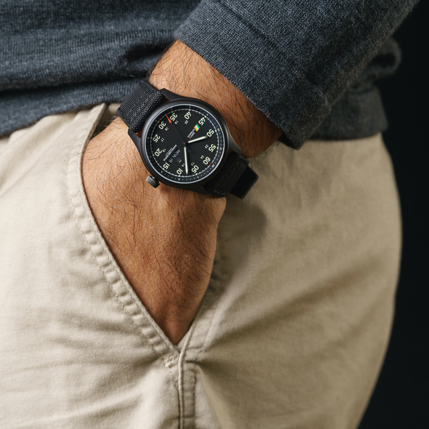 The “Civilian” has a simple 12-hour design with large Arabic numerals, while the more complex “Aviator” has a 24-hour design with the main numerals relaying minutes (05 to 60) and 24-hour time (13 to 24) circling just inside, and 12-hour numerals printed at the outermost perimeter. The brand’s logo is applied just above a day/date window at 3 o’clock. A red triangle at 12 o’clock is a classic Flieger design element, allowing pilots to immediately orient themselves to the dial layout. A limited edition of 21 MACH 1 watches will feature a dial comprised of aluminium alloy from a MiG 21’s outer skin, providing a unique piece of wearable history. A sapphire crystal with a triple anti-reflective coating comes standard on all models.