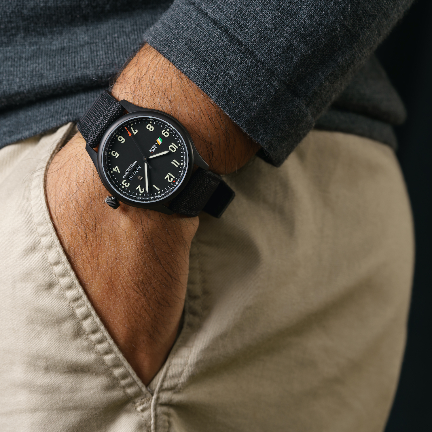 The matte black dial of the Bangalore MACH 1 continues the theme with the Indian Air Force tricolour fin-flash at 9 o’clock. The long, narrow hour and minute hands are filled with Super-LumiNova C3 and resemble those from a MiG fuselage, while the seconds hand is tipped with a red MiG silhouette. Large Arabic numerals are printed from Super-LumiNova C3 and the dial comes in two flavours.