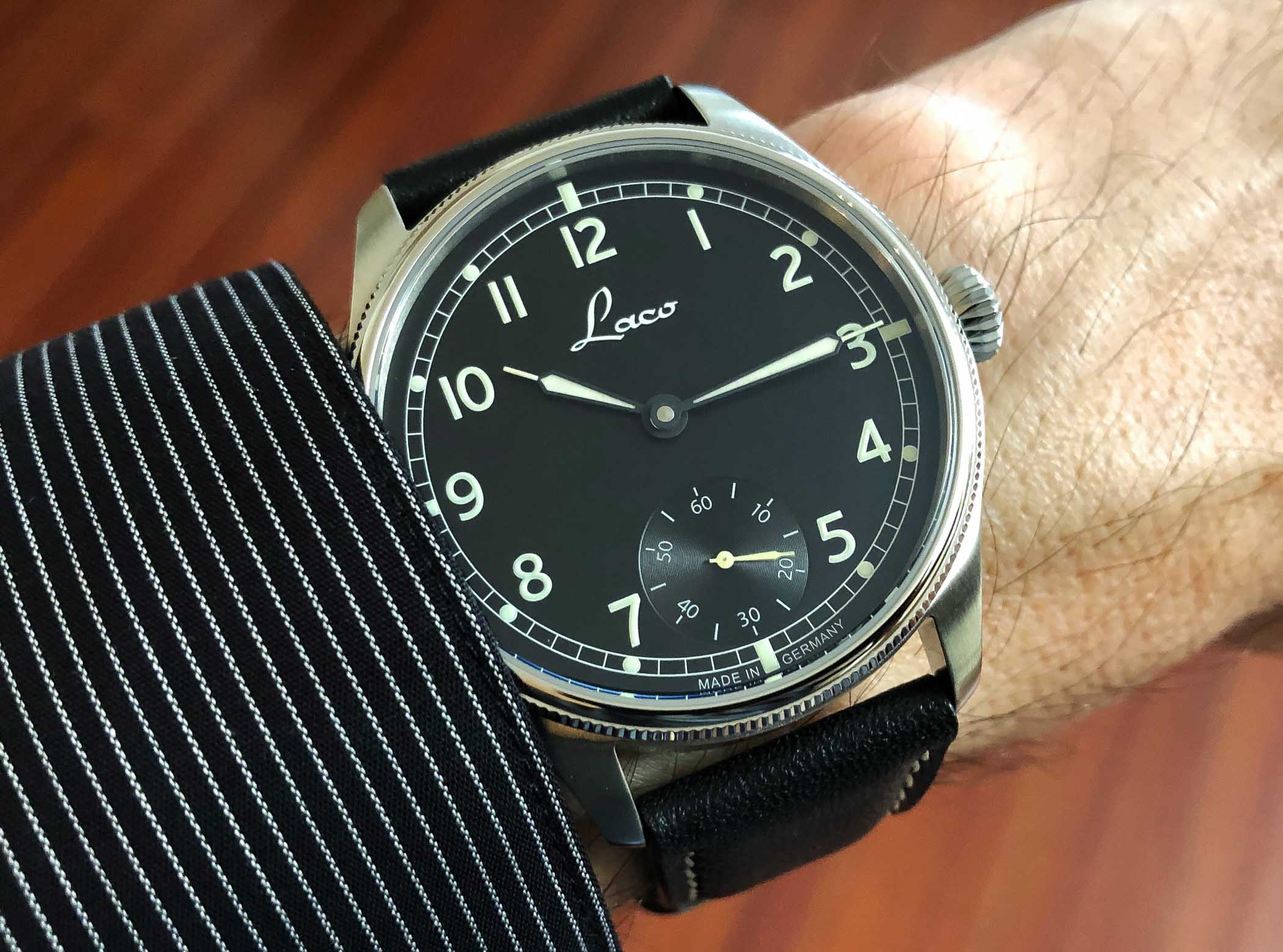 The crystal is flat sapphire with an anti-reflective coating and the caseback has an expansive sapphire window showcasing the ETA pocket watch-based movement that fills the entire back. The crown is large and easy to use for both winding and setting the time and has a kind of “half onion” shape with Laco’s logo embossed on a flat, polished end. The lug width is 22mm, common for a case of this size, and the watch is water-resistant to 100 metres.