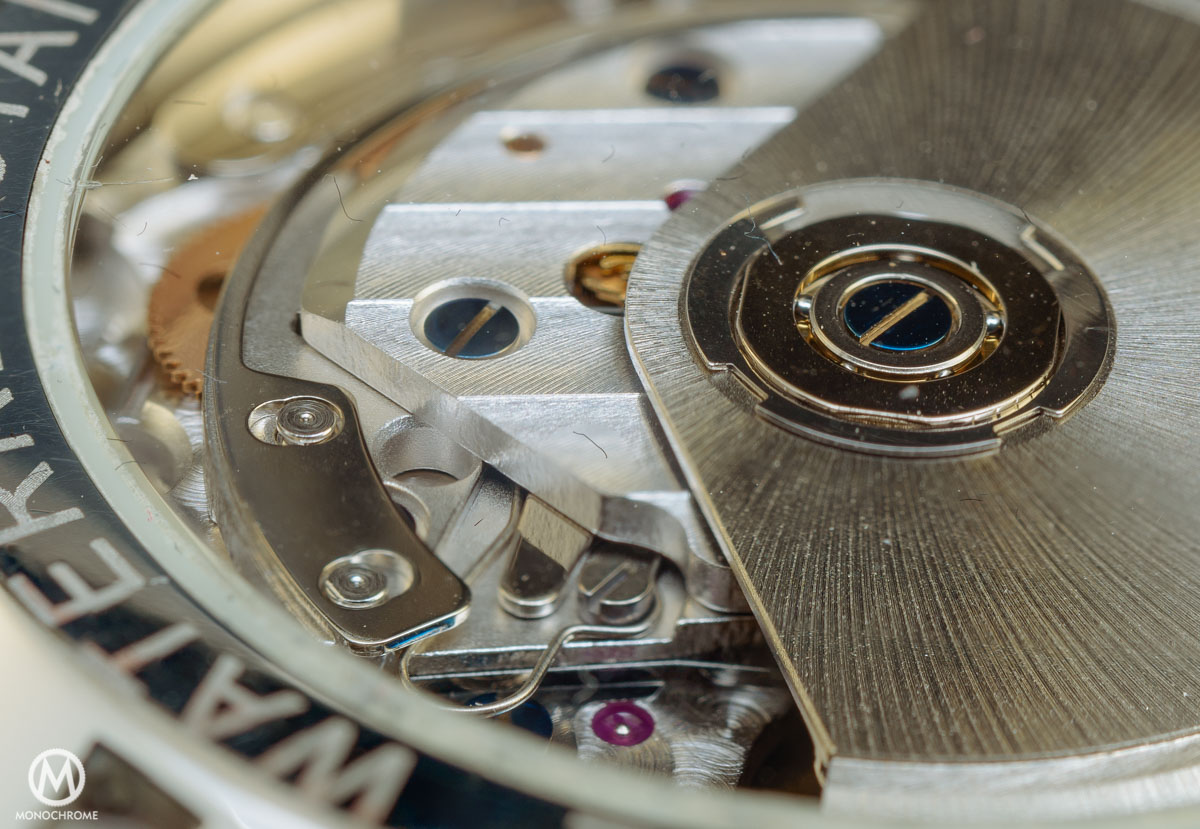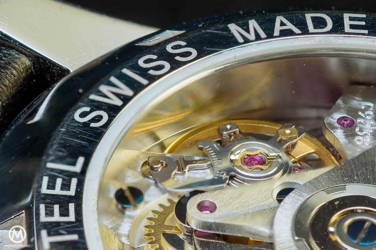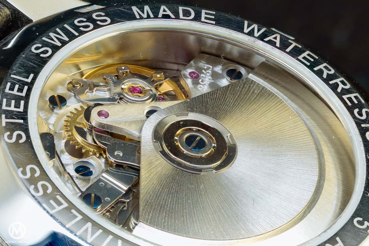 - Movement: modified mechanical ETA 7750 (to only have the centralized chrono hand), self-winding, 42 hour power reserve, frequency 28,800 semi-oscillations per hour, 240 parts, COSC-certified balance, diameter: 30mm, height: 7.90mm.