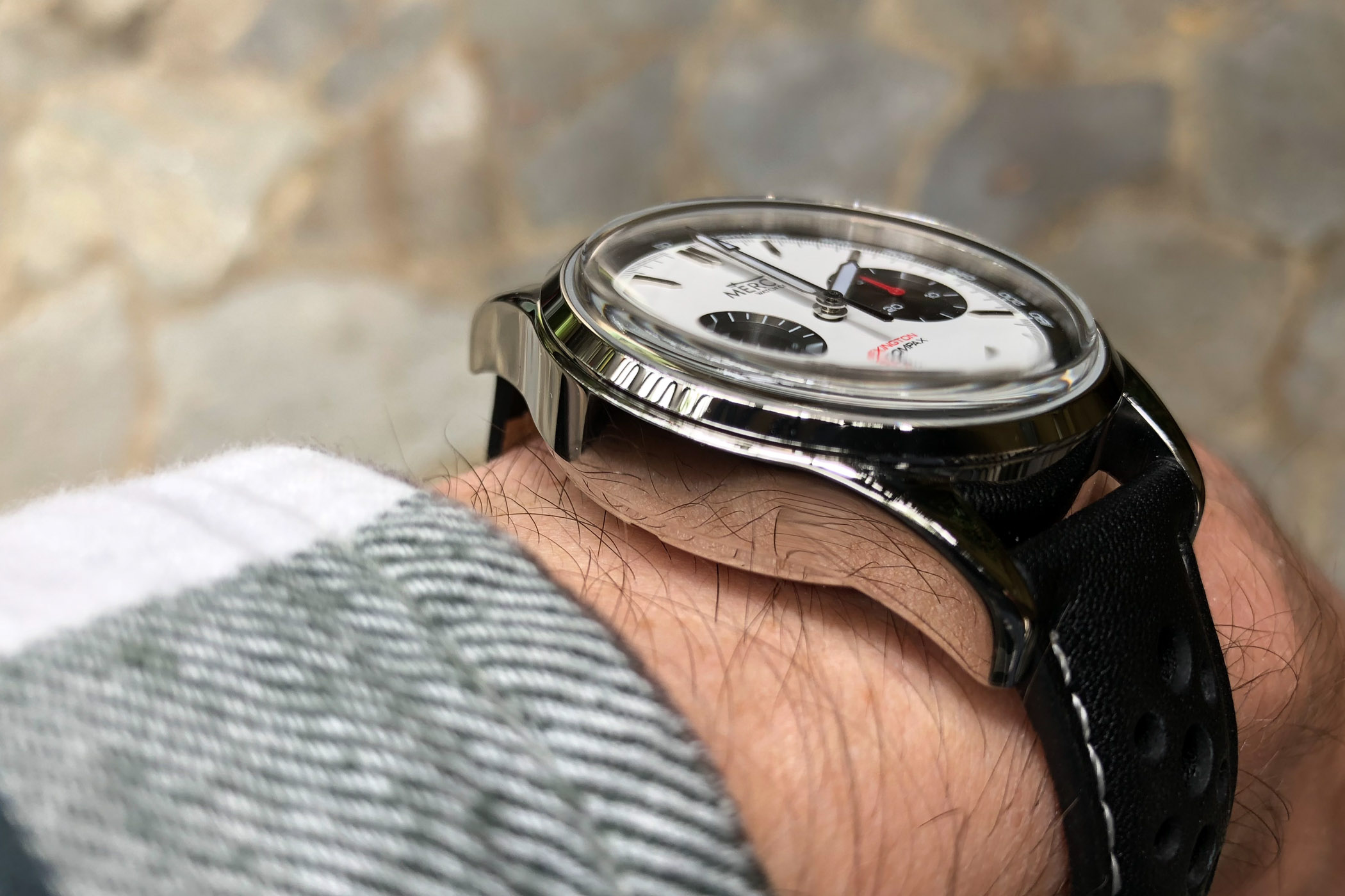 The case back has a K1 glass exhibition window displaying the decorated, manual-wind Seagull movement. The crown is stamped with an “M” and doesn’t screw down, leaving the case water-resistant to only 50m. It’s not a diving watch, so don’t treat it as such. Although the watch could be mistaken for a Hamilton or a TAG Heuer at first glance, it has a unique character of its own and isn’t trying to ride in the wake of a specific brand. If anything, it looks similar to the Long Beach Racing Chronograph from the Aramar Watch Company, a microbrand based in the Netherlands that also uses Seagull movements.