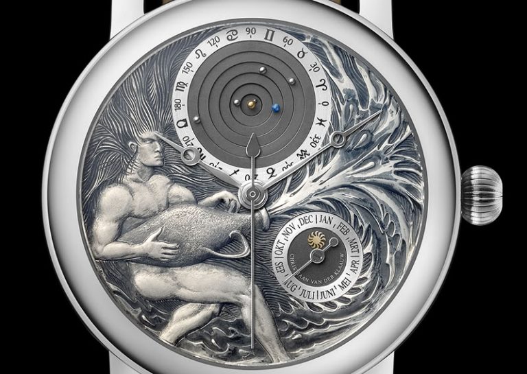 The lyrical artistic expression of dreams in gold and stone has been the domain of Van Cleef and Arpels for the past 118 years. For the past 6 years, Van Cleef & Arpels have made a reputation for presenting watches that have unique and playful displays. Lurking below the precious and artistic surface of the Midnight Planetarium Poetic is the handy work of a true Dutch Master, Christiaan van der Klaauw. Van der Klaauw is well documented on the pages of Monochrome-Watches.com for taking some of the most complicated astronomical events and finding a way to express them in miniature mechanical form.