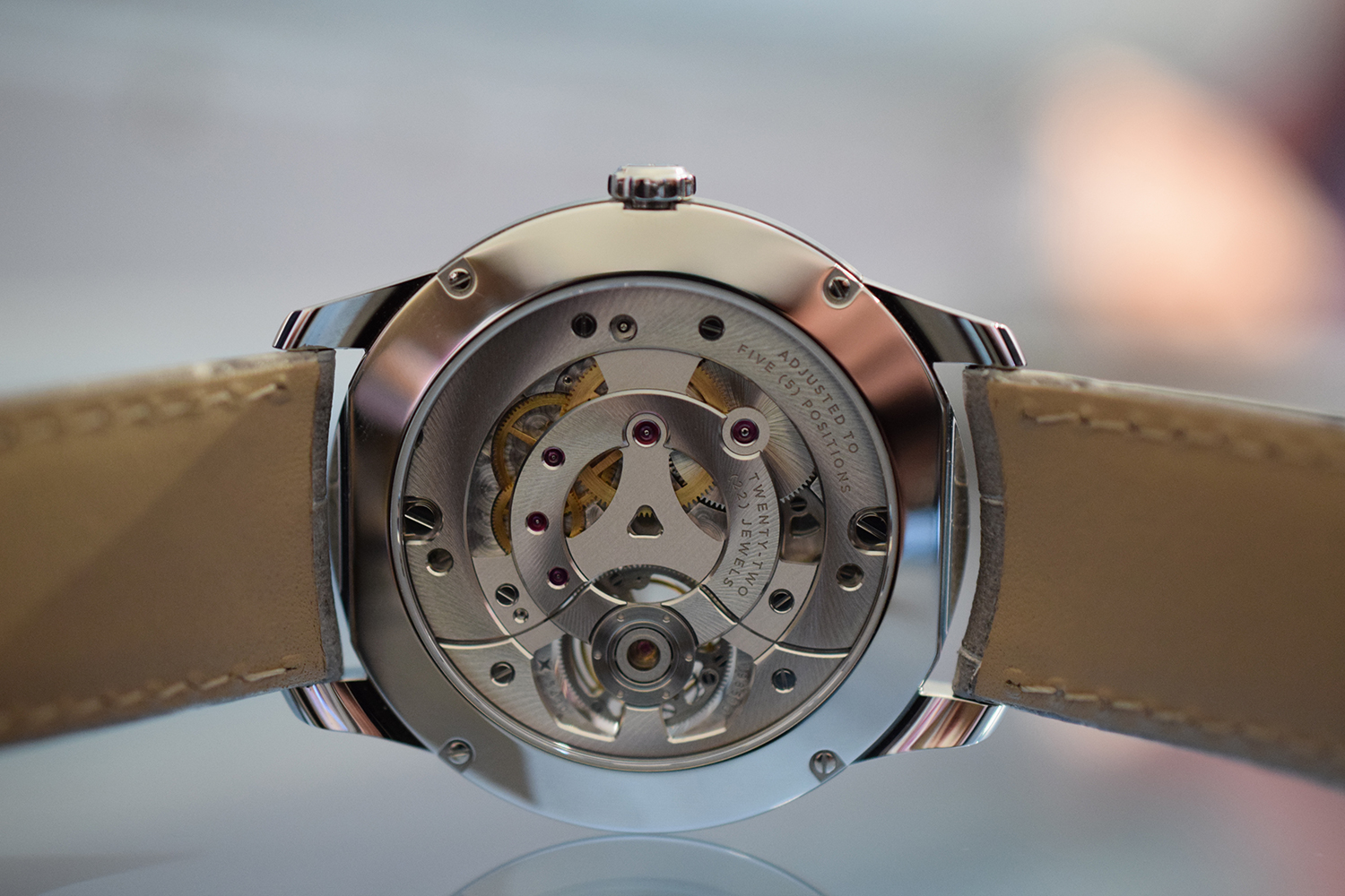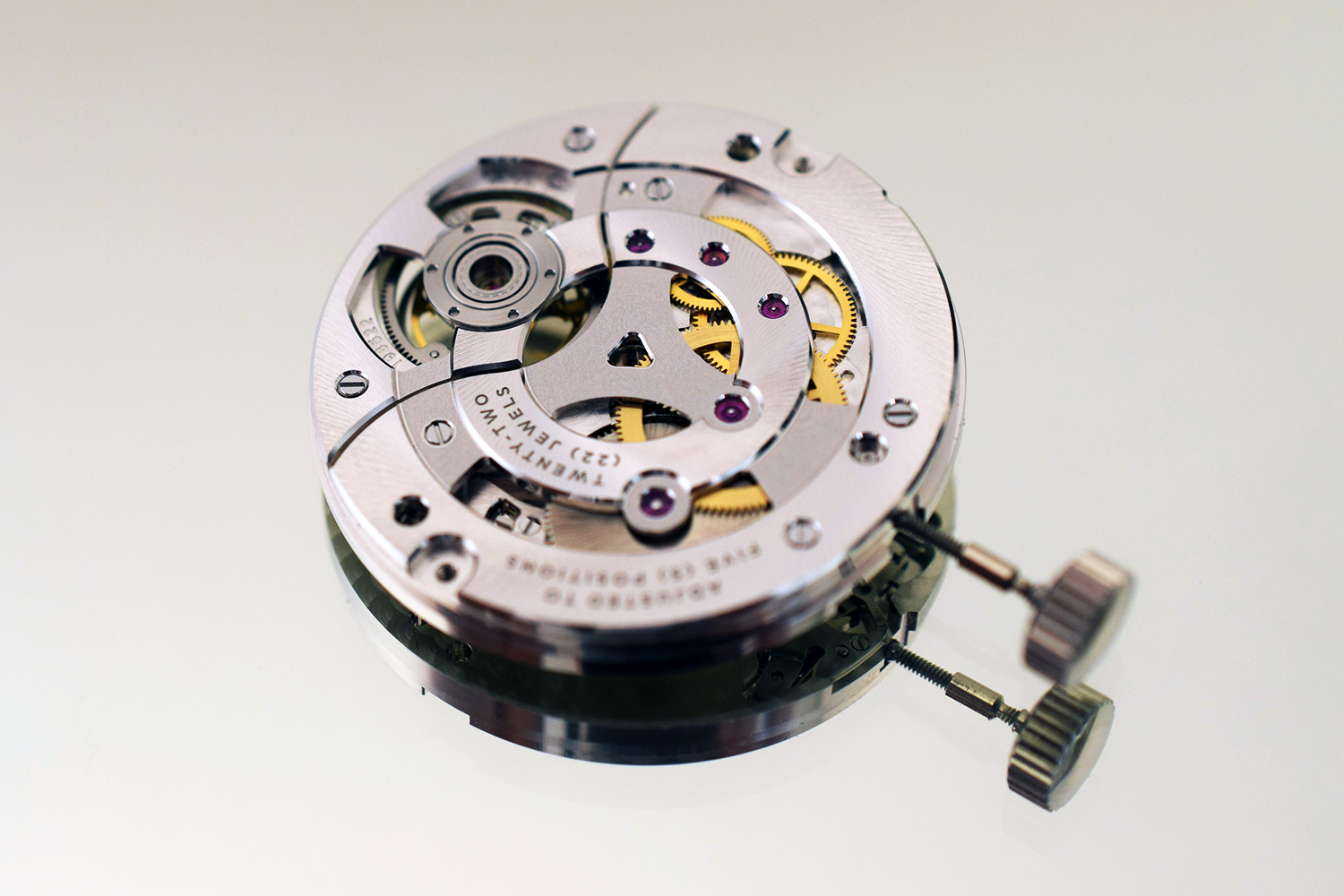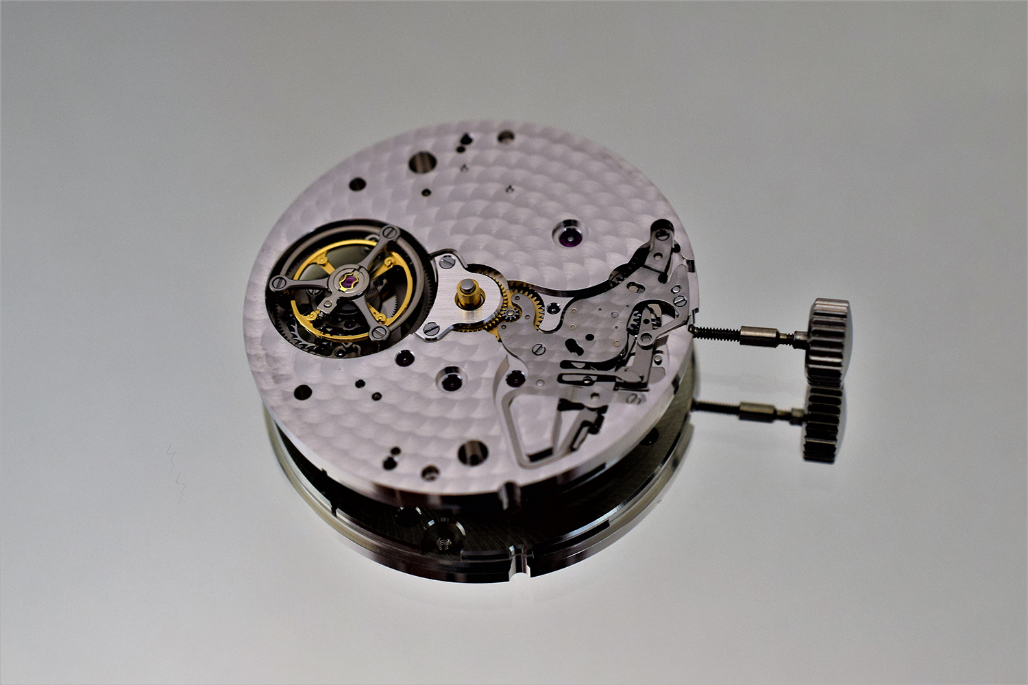 For the ‘promotional’ version, the movement is nicely finished with circular graining on the main-plate. The bridges feature double snailing. The chamfers, sinks and counter-sinks are diamond-polished. The screw heads are black polished. Naturally though, all of this is completely customizable. Let’s take a close look at its inner workings.