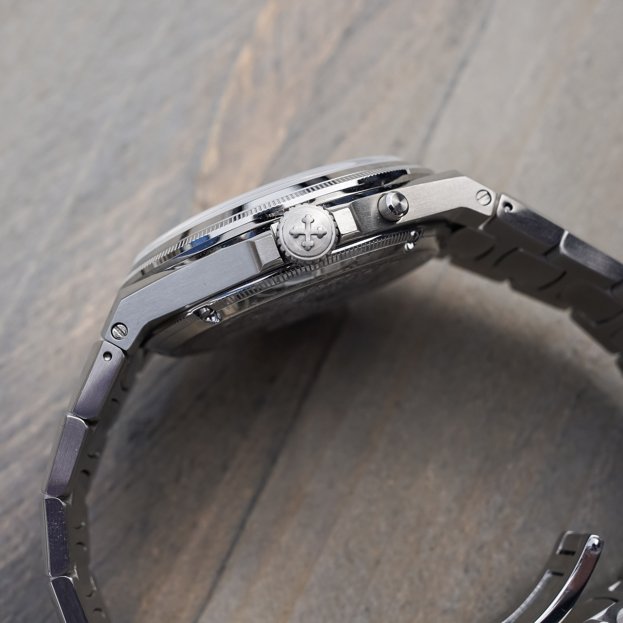 On the wrist, the 40mm case feels a bit more compact than you might expect because of how it flows into the integrated bracelet. That is something the Arsenale line has done well from the start with relatively slim cases, an integrated design, and a look that sits somewhere between sporty and dressy. Here, the case comes in at just 9.6mm thick (without the crystal), which is pretty decent considering everything going on inside.