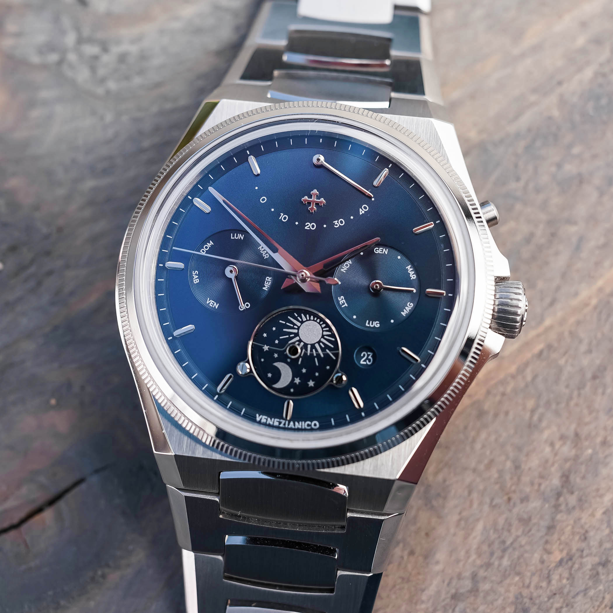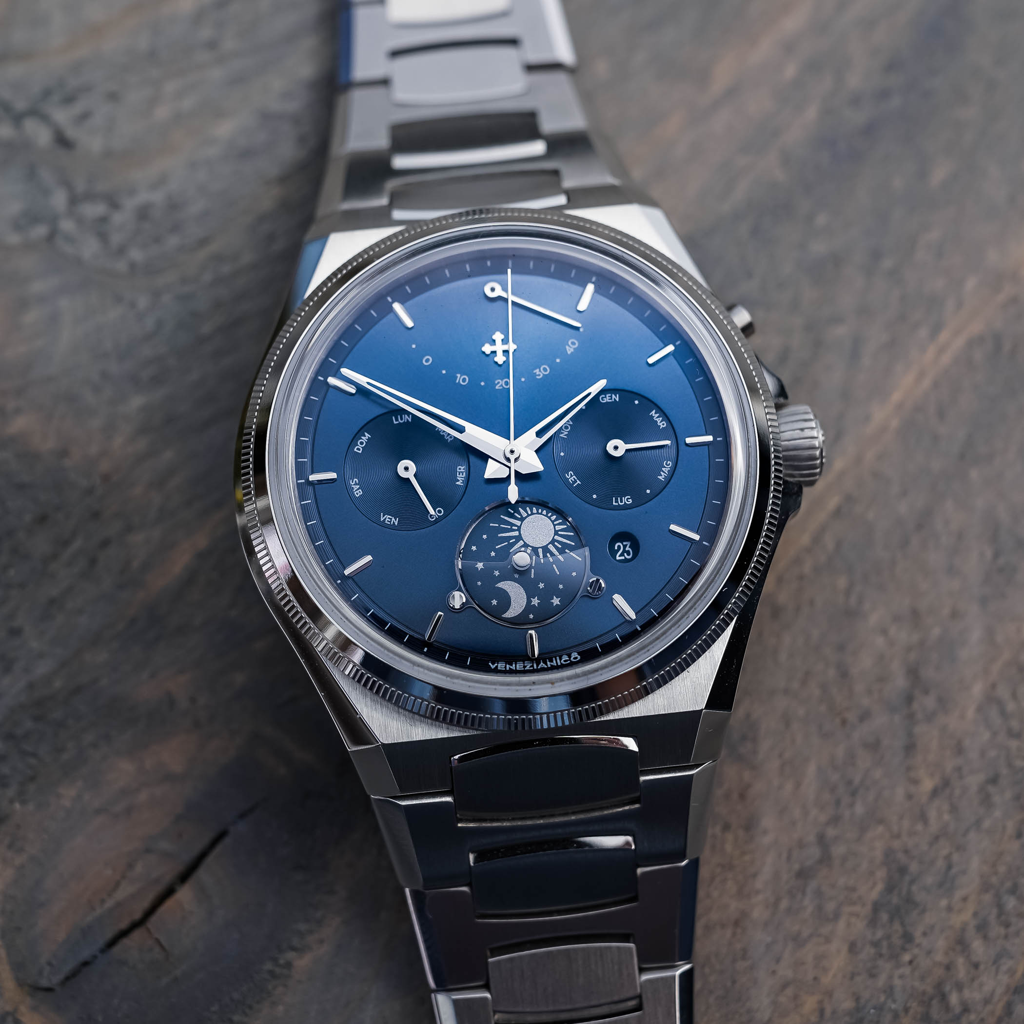 Founded in 2017, Italian brand Venezianico has caught attention with its stylish, well-priced watches that often play around with materials and design. From pieces inspired by Venetian architecture to a recent Redentore with a guilloché pattern depicting the Venetian lagoon’s tides, there is usually a bit of character in what they do. Inspired by the historic Arsenale di Venezia, the Arsenale line is no different, with integrated designs paired with bold dials, from deep fumé tones to more textured finishes. With the new Arsenale Calendario, that same base now carries a lot more on the dial. You get a complete calendar, a power reserve, and a day and night display, all within the same integrated steel case.