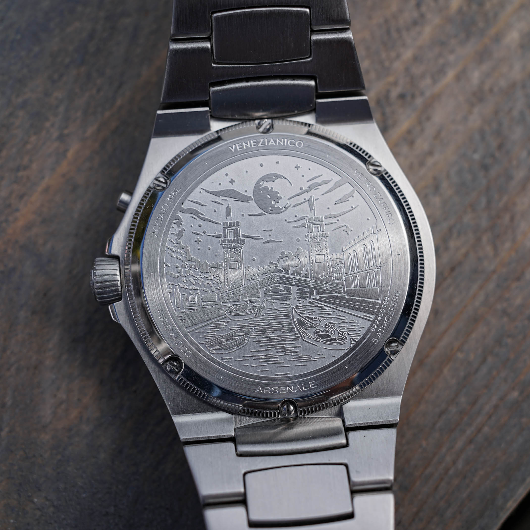 The caseback features an engraved view of the Venice Arsenale. You will also notice the mid-case with a broad, polished bevel and a sloping bezel topped by a raised, double-domed sapphire crystal. The bezel also has a light knurled pattern, and this detail is repeated on the caseback as well. There is also a small pusher at 2 o’clock for adjusting the month, which is practical, even if its shape and height could have been adjusted a bit better.