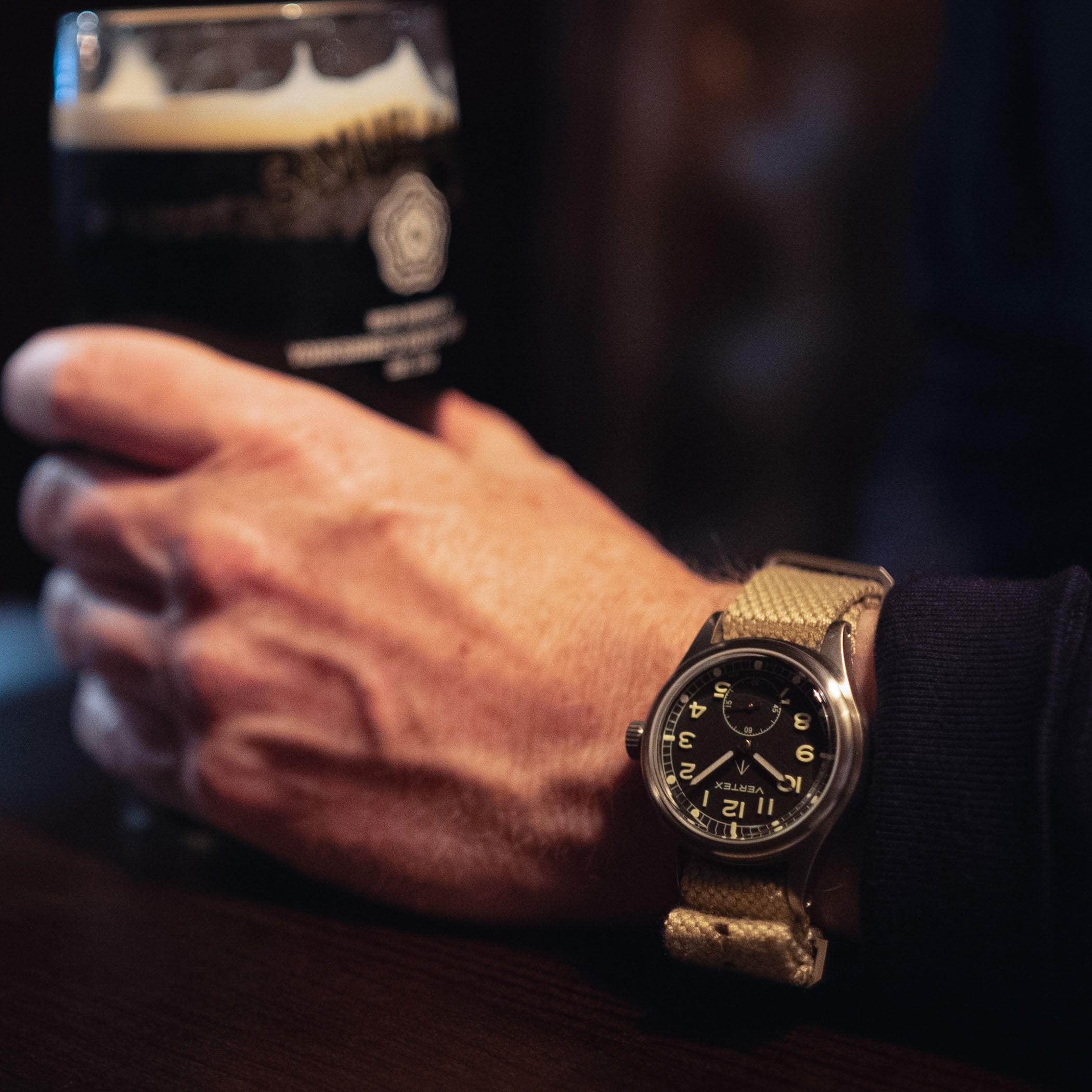 Fast forward to 2024, and Vertex released the watch we are discussing today: the M36. It’s less of a tribute and closer to a 1:1 recreation of a Dirty Dozen field watch, but still with a few modern updates. I bought one of these for myself back in May of 2024, and arranged to pick it up at the Vertex boutique in London. Mr Cochrane was a gracious host, meeting with me and showing me around the small Vertex boutique. Having had the watch for the rest of that U.K. trip and the 18 months since then, I think I’m qualified to speak to its pros and cons. But first, let’s go over the spec sheet.