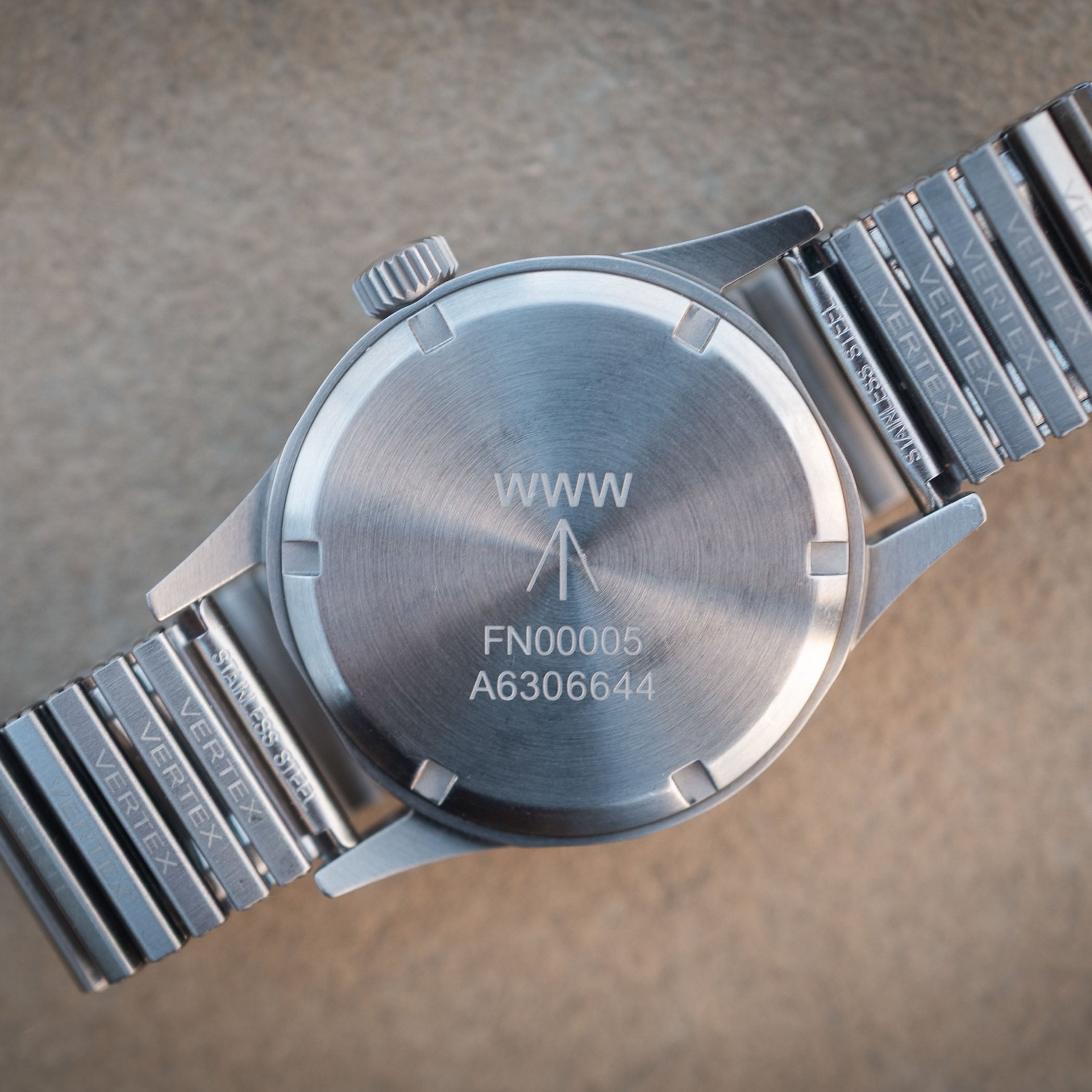 As the name implies, the Vertex M36 is a 36mm field watch, bringing it down to the same size as the original Dirty Dozen watch. It’s rendered in brushed stainless steel and has a lug-to-lug measurement of 46.5mm. The thickness is listed as 11mm, but add another 1mm or so for the double-domed sapphire crystal. The dial is matte black and is true to the original in virtually every way. The only visibly modern update is that the printed, Arabic numerals of the original have been replaced with a modern Vertex trademark, the 3D numerals sculpted out of luminous material. The crown has also been updated to the screw-down variety to aid in upgrading the water resistance to a respectable 100 metres. The caseback is of the screw-on variety and retains the cool W.W.W. engraving of the Dirty Dozen watches, denoting it as a “Watch.Wrist.Waterproof.”