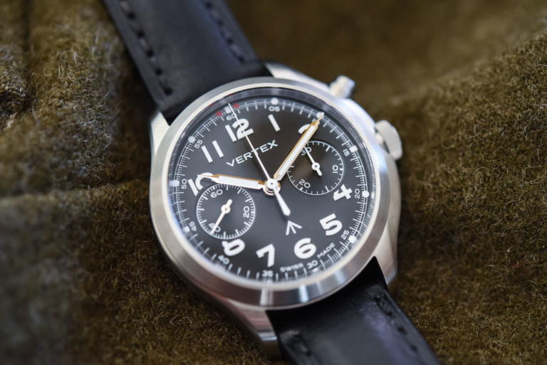 To coincide with the opening of its new two-month residency at London’s Chelsea Barracks, Vertex has just released a new vintage-inspired take on its signature monopusher military chronograph, the MP45, which we’ve extensively reviewed already here in its classic steel version. But here, the idea was to bring back the look of the old days, and some clear military / MoD inspiration.