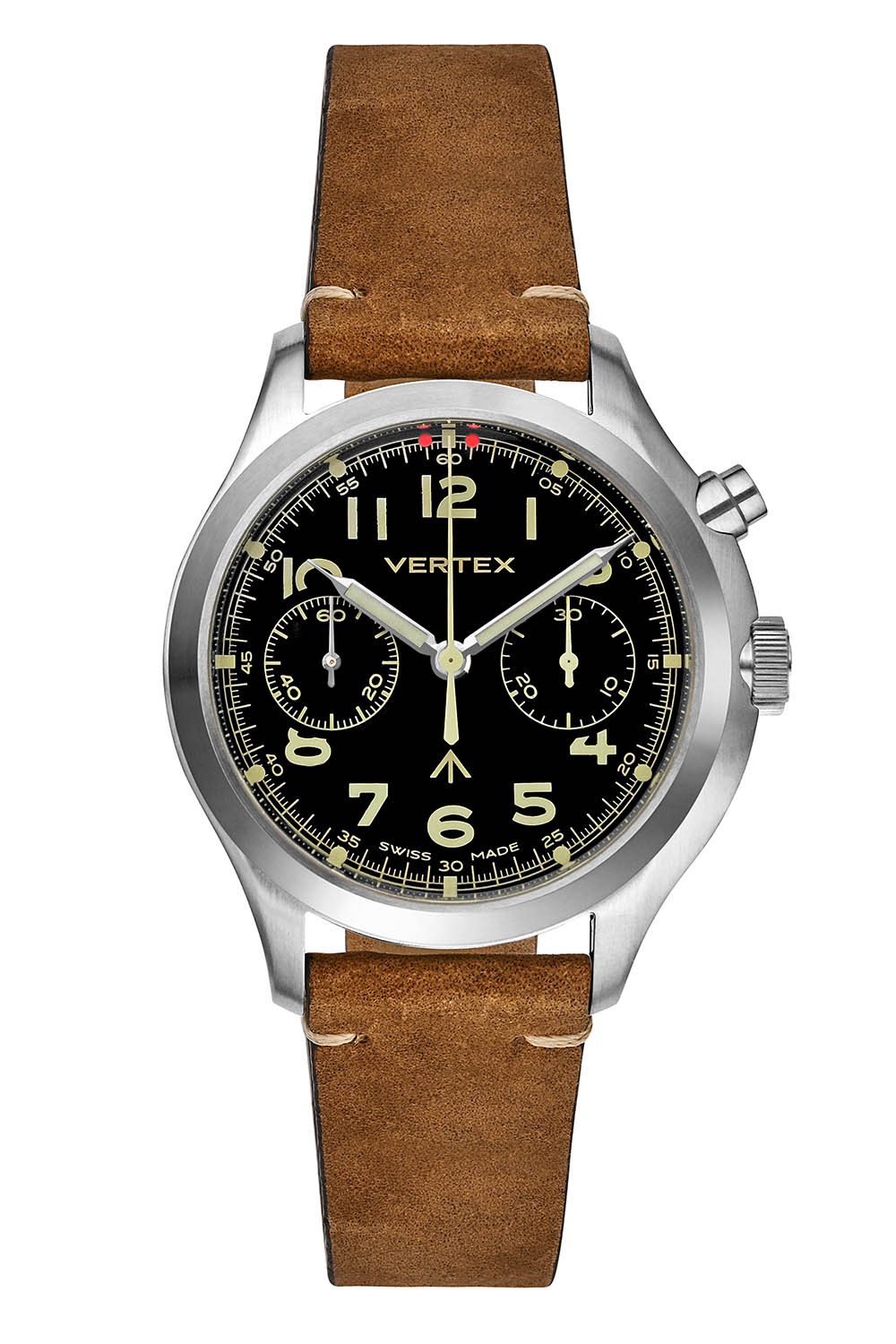 The Vertex MP45 Heritage Edition, like all other editions of this watch, pays homage to the monopusher ordnance timing watch, first commissioned in 1945, but of course, in a far more modern way. This is one of the characteristics of Vertex, not to only make re-editions, but 21st-century versions of iconic models. As such, we find the classic elements of the MP45, meaning a 40mm stainless steel brushed case, with a typical asymmetrical shape – the right side being more robust, in order to bring protection to the semi-recessed crown and the pusher. The case is topped by a double-domed sapphire crystal and is water-resistant to 100m.