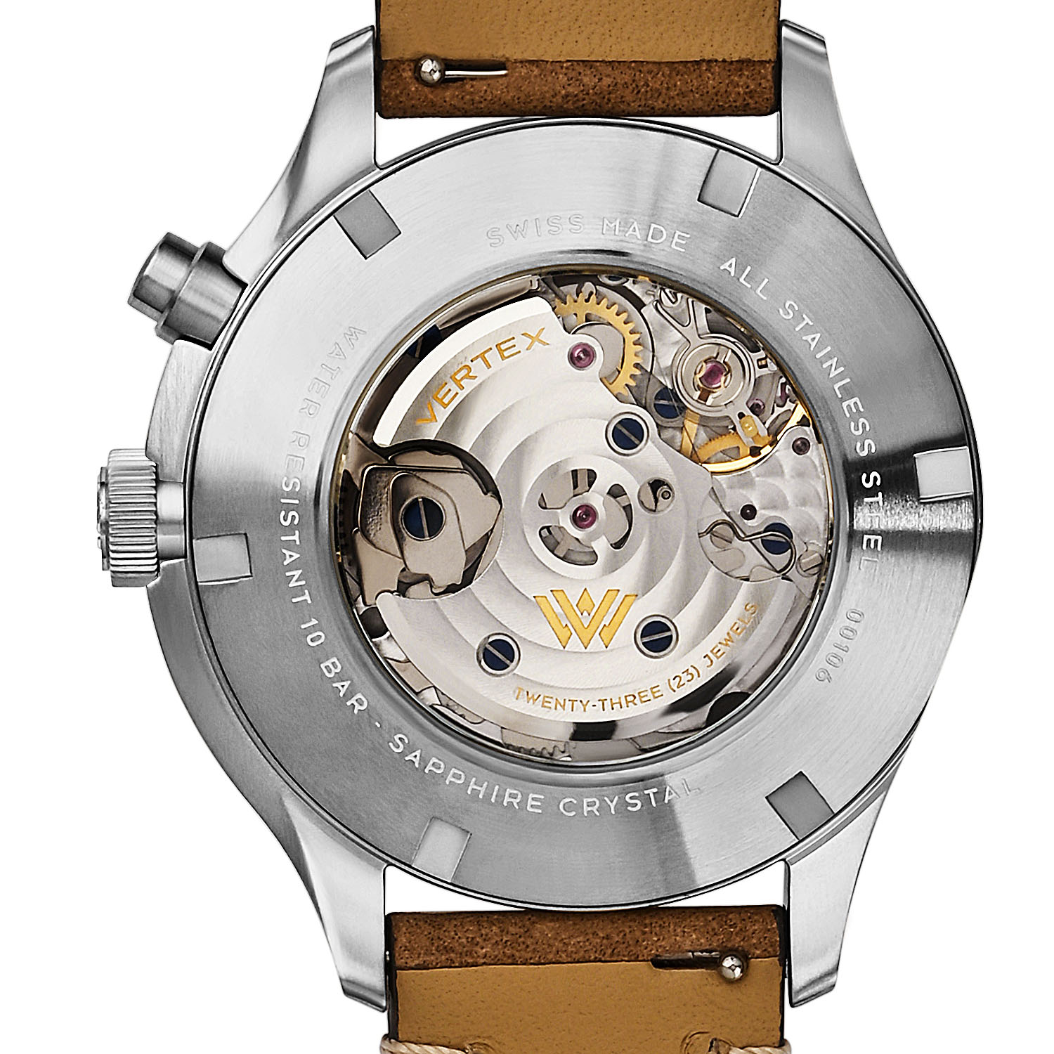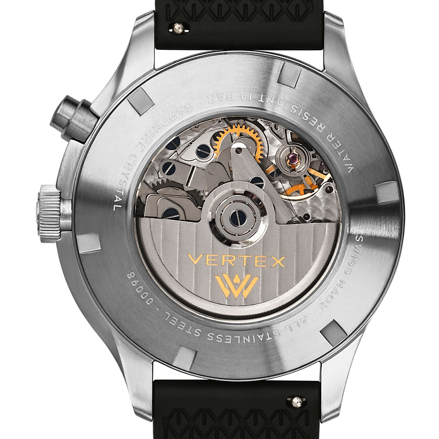The other specificity of the Vertex MP45 is that it is a monopusher chronograph – all actions are done via the single push-piece at 2 o’clock – and can be chosen with an automatic or a hand-wound movement. The base, in both cases, is the same, a solid Sellita SW510 MP (with 7750 roots). Visible through the caseback, it’s nicely decorated and otherwise has the same specs as all Sellita-based watches – 4Hz frequency, cam-lever chronograph, 48h power reserve.