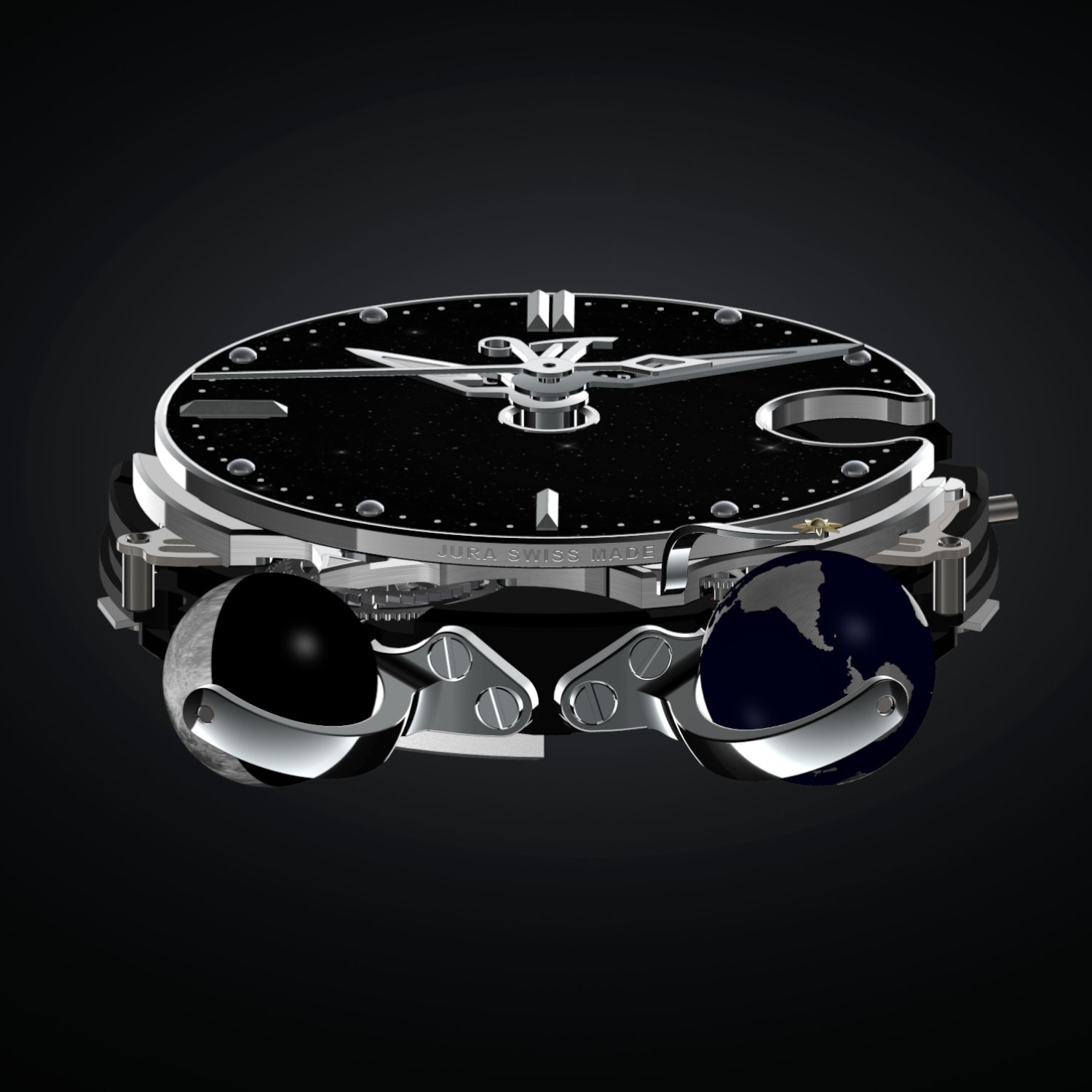 The dial for each one is made of shimmering black aventurine glass, which resembles a starry sky or a galaxy far, far away. The slightly off-centred dial displays the hours, minutes, and seconds with a set of curved polished and rhodium-plated hands with white BGW9 Super-LumiNova. A large, circular aperture on the right-hand side of the dial reveals the date. Positioned below the dial is the double astronomical representation of the Moon and Earth (accompanied by a miniature sun). The spheres are made in titanium and finished by hand. Each rotates at its own speed, once every 24 hours for the Earth and once every 29,53125 days for the Moon. More details about this impressive complication can be found here.