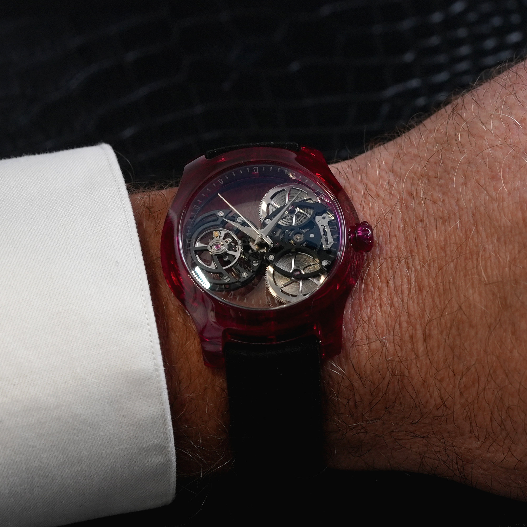 It must be said that in recent years Yvan Arpa seems to have toned down the craziness a little and is shifting towards a more puristic approach to watchmaking. Yet, in his true sense of style, his latest watches still challenge the visual senses to the max, most often thanks to (nano-)sapphire crystal cases. Watches like the Tiny Purity Tourbillon Chameleon or AquaSaphir lure you in with unbridled transparency and vibrant colours. But even simpler watches like the rather clever Depth Gauge defy tradition and carry Arpa’s signature style of holding nothing back. The collections are often quite varied but produced in low volumes, giving Yvan Arpa total creative freedom.