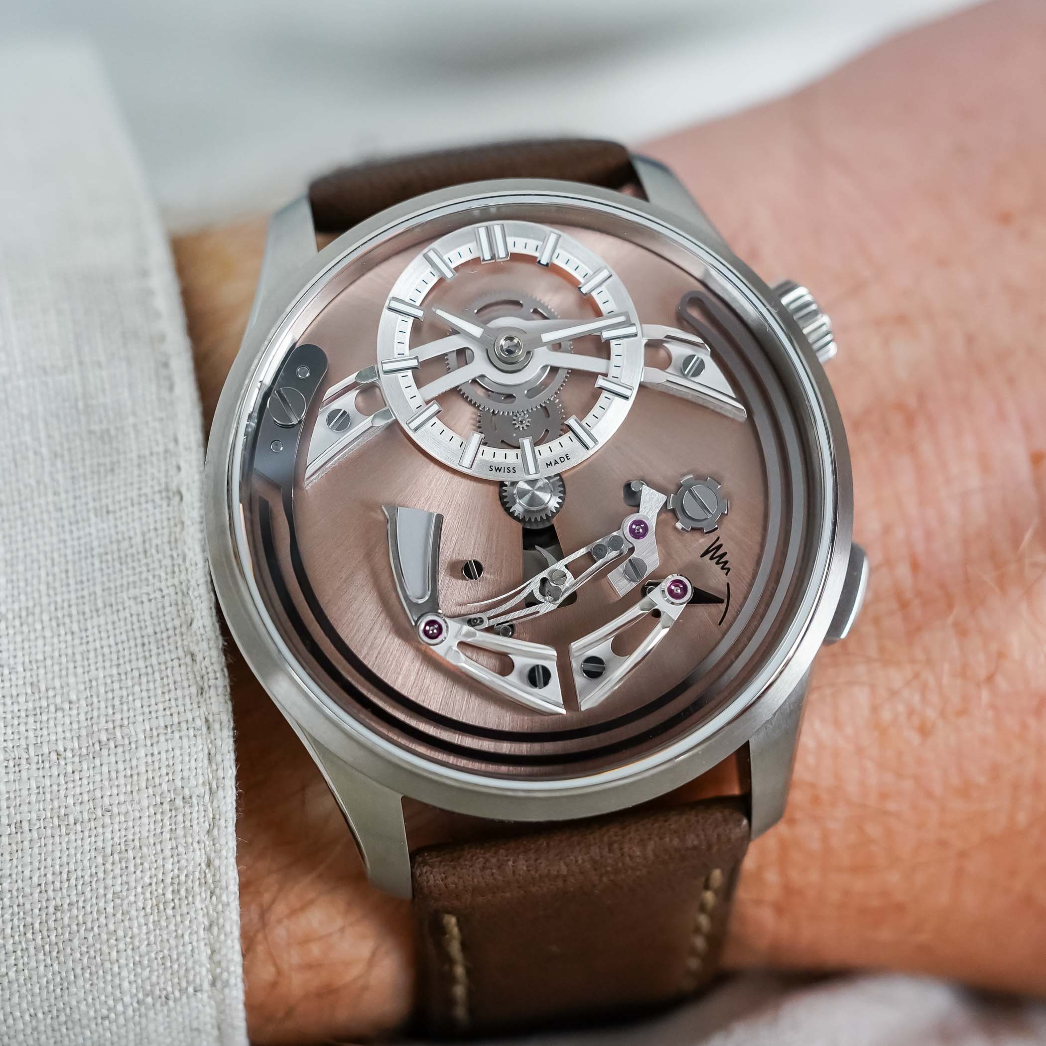 And the best part? Most of this is shown right on the Rosa Gold sunray brushed dial! Other colours are available as well, but we’ve always had a soft spot for salmon tones. Anyway, the whole striking mechanism is suspended under multiple bridges and can be fully admired up front. From any angle, there is a ton of detail everywhere you look. From the mounting of the gong, the way it loops back on itself, the architecture of the bridges, the charging mechanism and so on. There’s a lot to love.