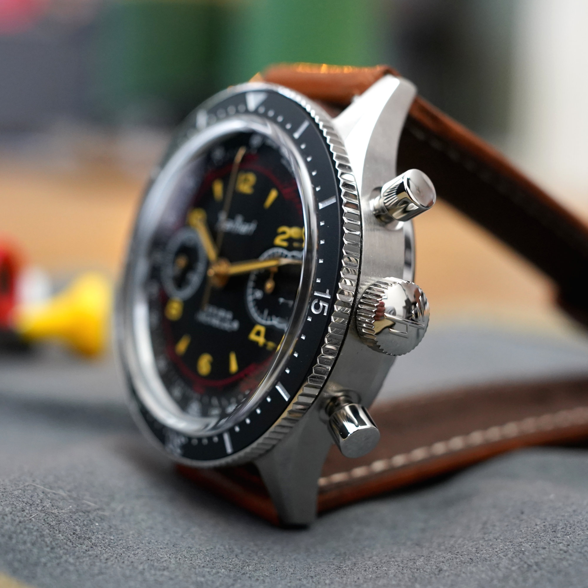Moving to the face of the 415 ES is where things get even more fun. The matte black base dial is finished with a mix of colours: yellow for the hour markers, white for the tachymeter and sub-dial scales, and red for the 100-unit scale. This unit scale was a practical feature in industrial factories, for instance, and could be used to calculate and manage productivity. The sword-shaped hour and minute hands have a lovely golden finish and Super-LumiNova inserts. A very nice touch is the bent tips for both the central minutes hand and the chronograph seconds hand, adding character and depth to the 415 ES. The finishing touch is the return of the winged Hanhart logo.