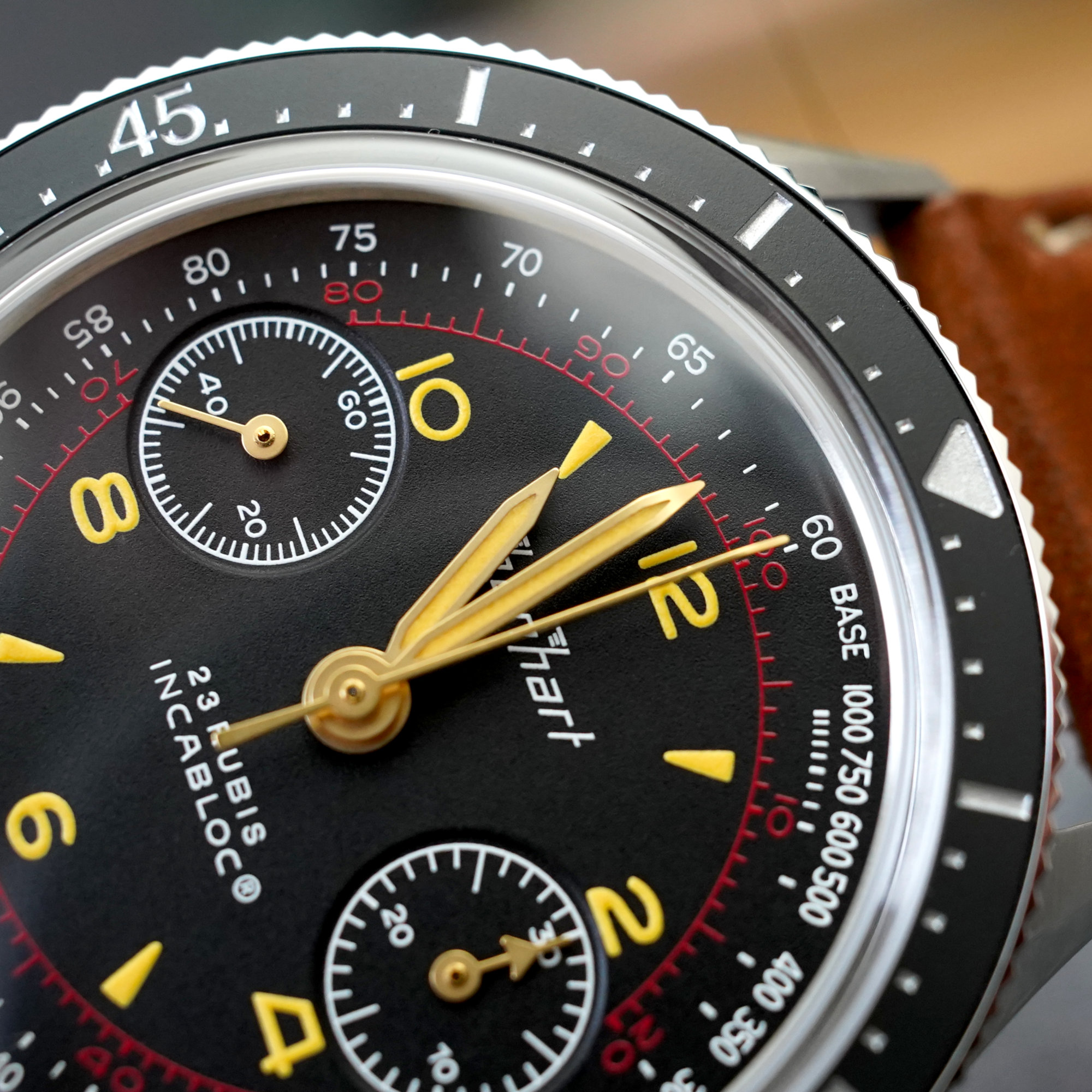 A very faithful recreation of a vintage Hanhart pilot chronograph from the mid-1960s.
