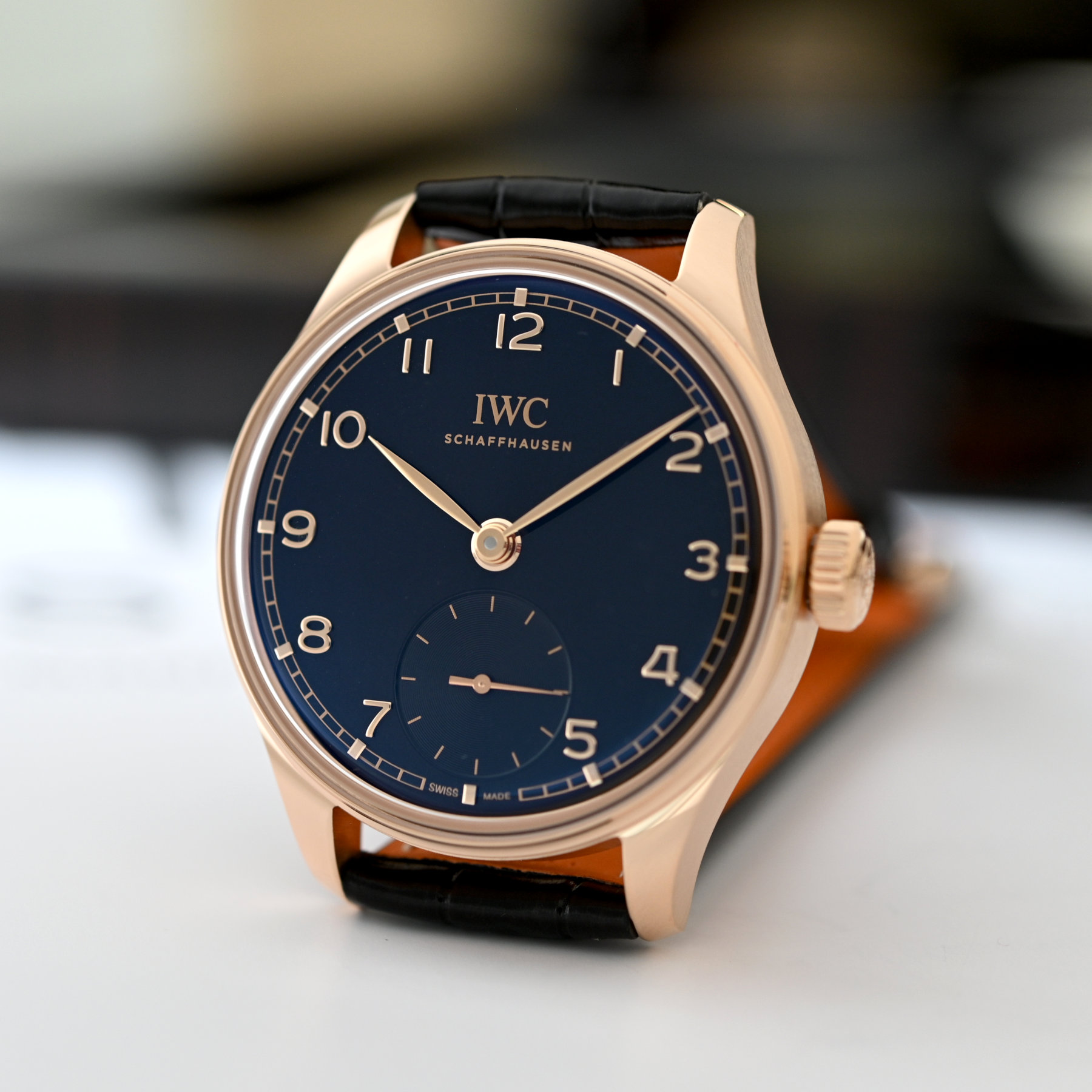 Quick Facts – 40.4mm x 12.4mm – white or rose gold case – double box-shaped sapphire crystal on front and back – 50m water-resistant – Horizon Blue or Obsidian Black dial – sunray-brushed finish – rhodium- or gold-plated markers – leaf-shaped hands – recessed small seconds sub-dial – calibre IW 82200, in-house automatic – 28,800vph – 60h power reserve – Santoni black or gradient blue leather strap – IW3584 – CHF 17,300 (rose gold) – CHF 18,300 (white gold)