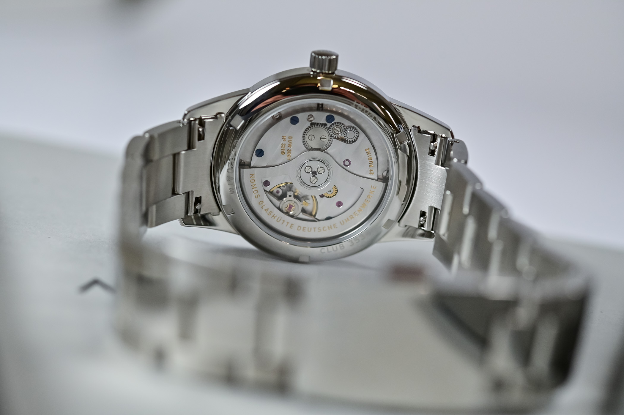 The dial of this new 37mm Nomos Club Sport is available in two tastes; Polar Blue and Petrol Green. A no-date model (contrary to the 42mm version), it features large hour markers and bold hands to make it contrasted night and day. And inside, there’s an in-house movement, calibre DUW 3001. Nice and well-finished, it can be hidden behind a closed back, or visible under a sapphire crystal on option, as you’ll see in the video.