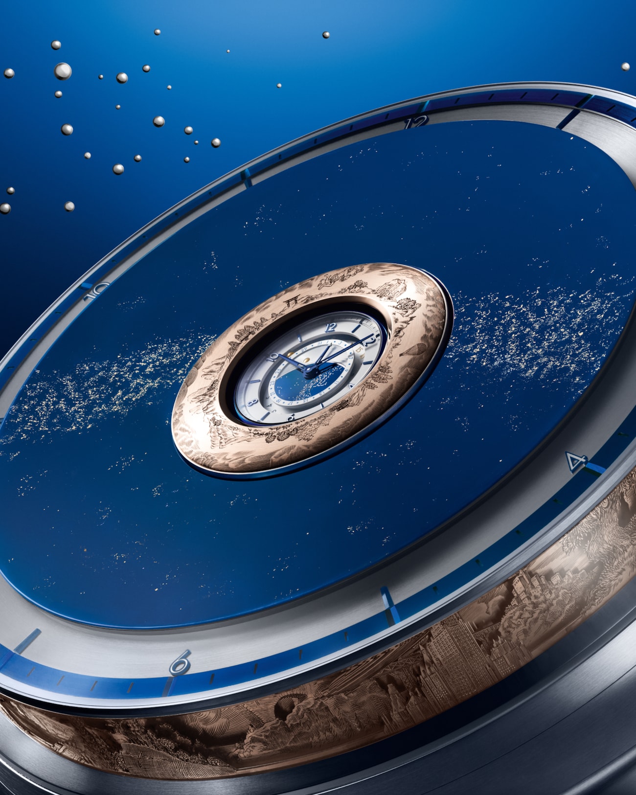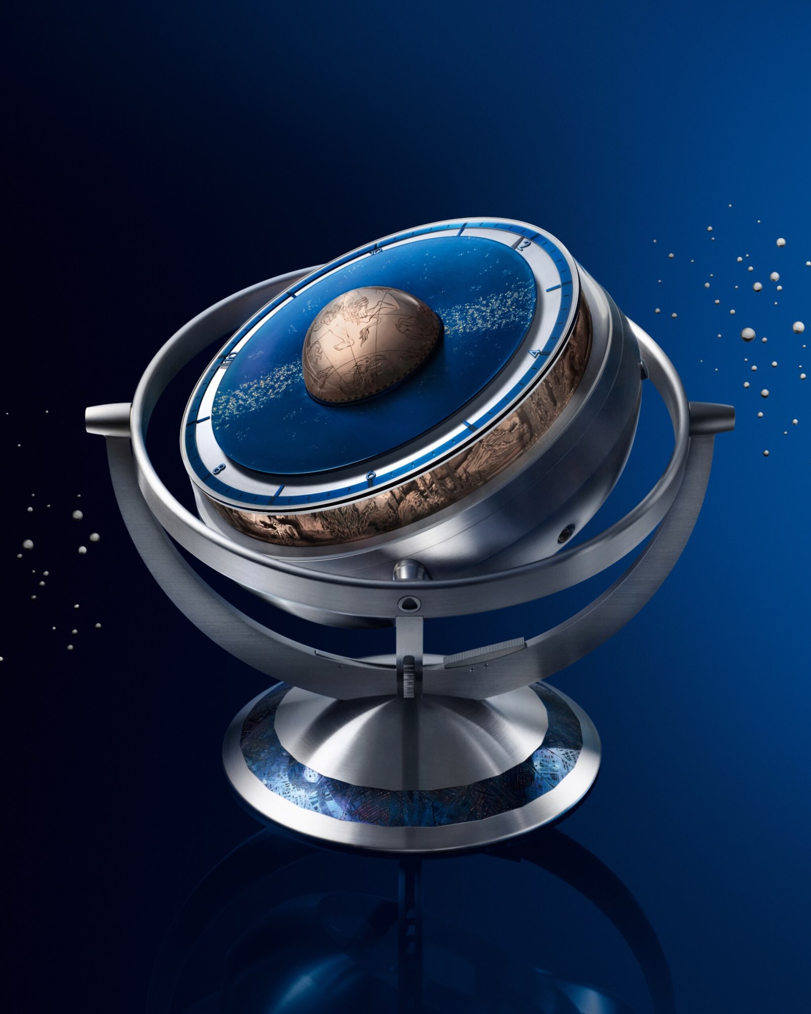 The docking interface – the key to the Sympathique function – is discreetly concealed beneath a domed, engraved cover on the upper tier of the clock. Crafted in rose gold, the dome is adorned with the constellation of Hercules. When placed in its cradle, the LVDB-03 GMT Louis Varius wristwatch engages the clock through its crown. Over the course of 10 hours, the system automatically winds the watch, and every two hours, a dedicated mechanism housed at the back of the timepiece resets its display to match the master clock, bringing the two into synchrony. The watch can be rewound in as little as one night when the watch is regularly paired with the clock. The LVDB-03 Sympathique Louis Varius allows the watch to dock without removing its bracelet or performing any preparatory steps.