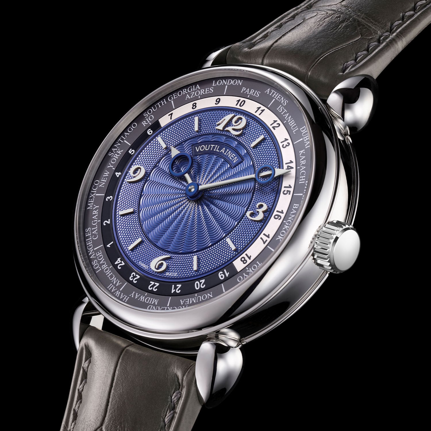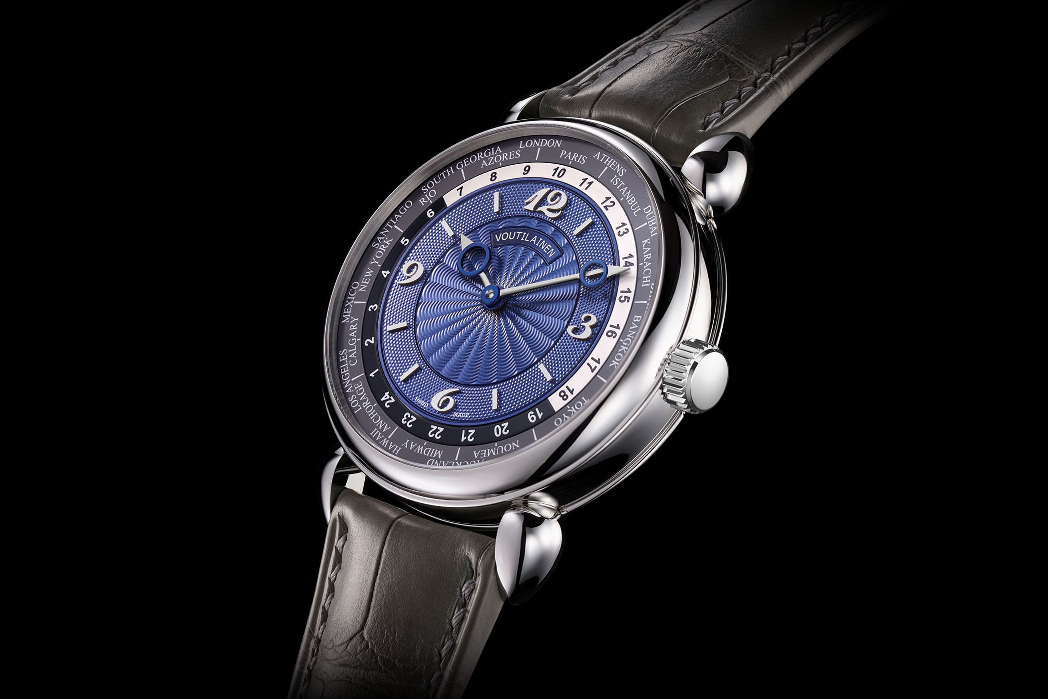 Returning to a more traditional round case, the latest world time watch is a refined example of Voutilainen’s aesthetic and mechanical prowess.
