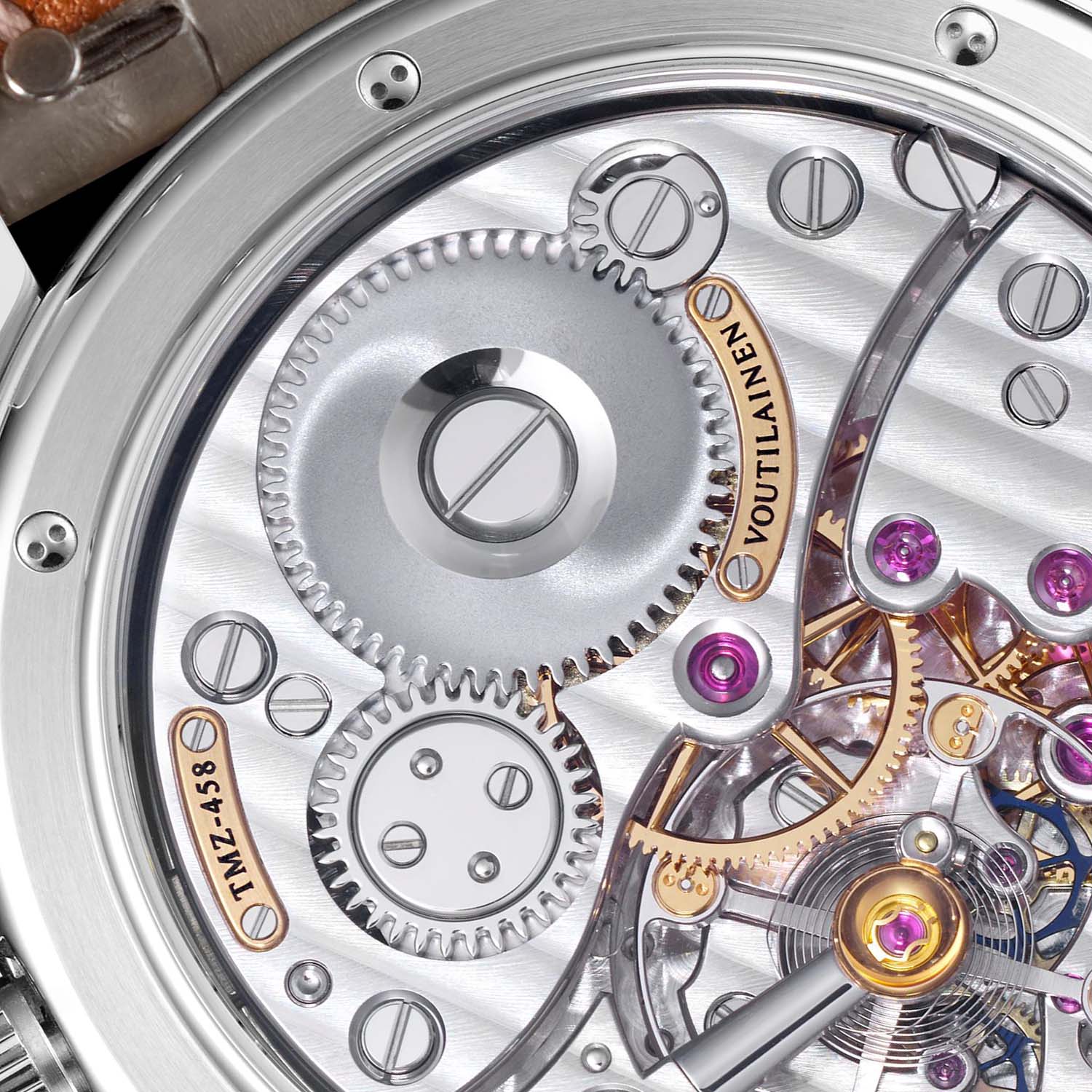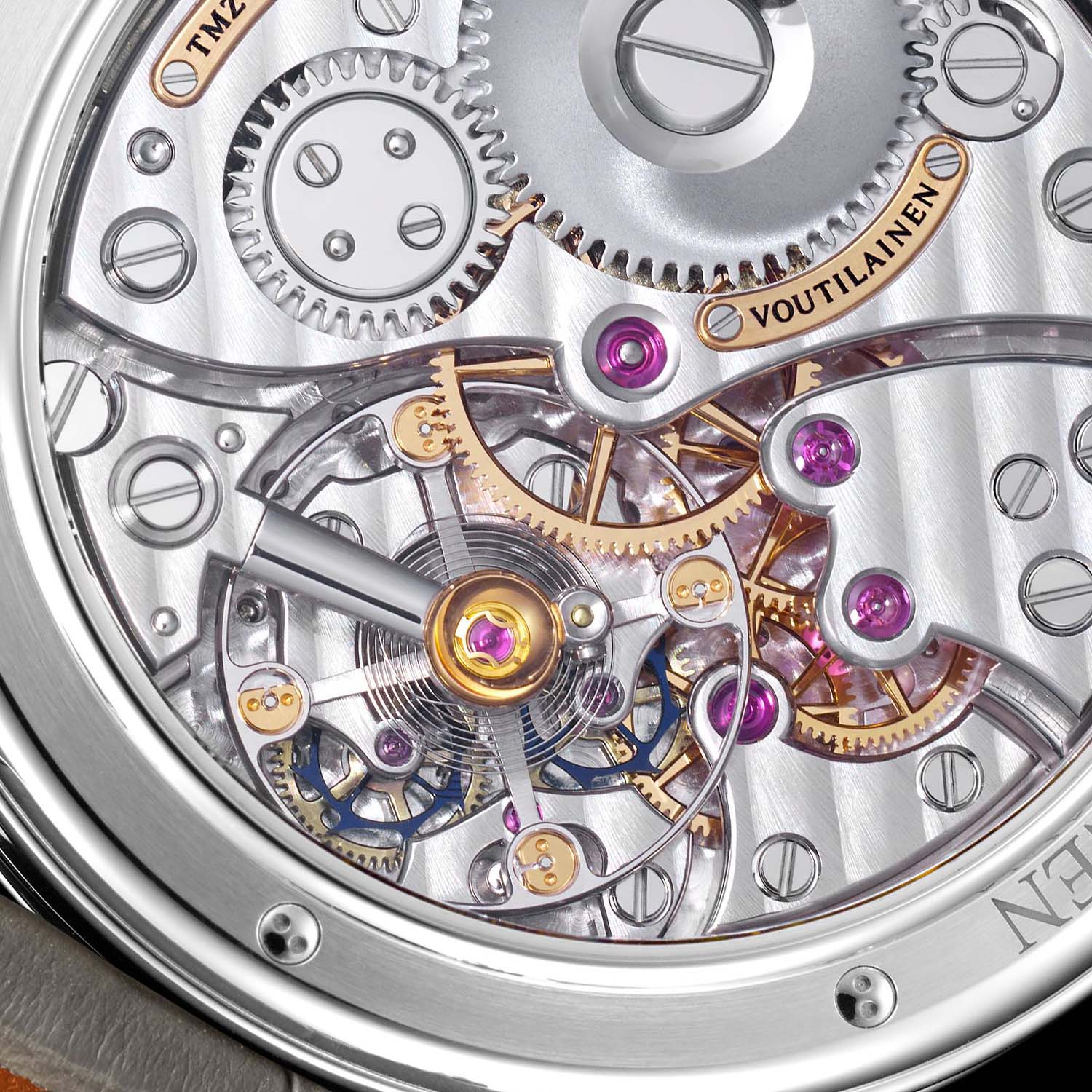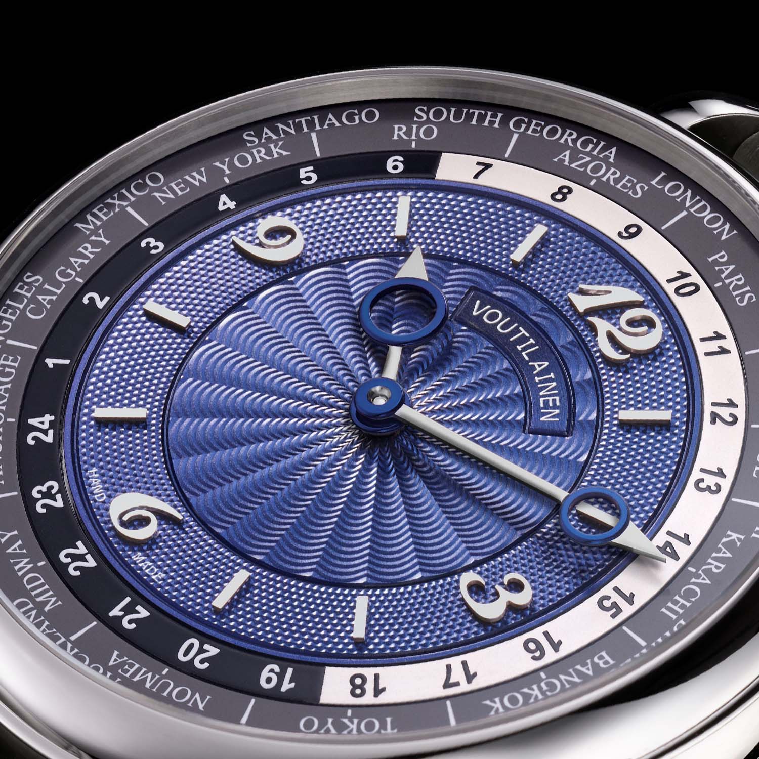 Marking it as an original Voutilainen watch, the blue central area of the dial is beautifully decorated with hand-guilloché patterns. Like Abraham-Louis Breguet, Voutilainen uses guillochage as a functional and aesthetic element. Having acquired the historical Comblémine dial manufacture, Voutilainen owns antique hand-operated rose engines and lathes.