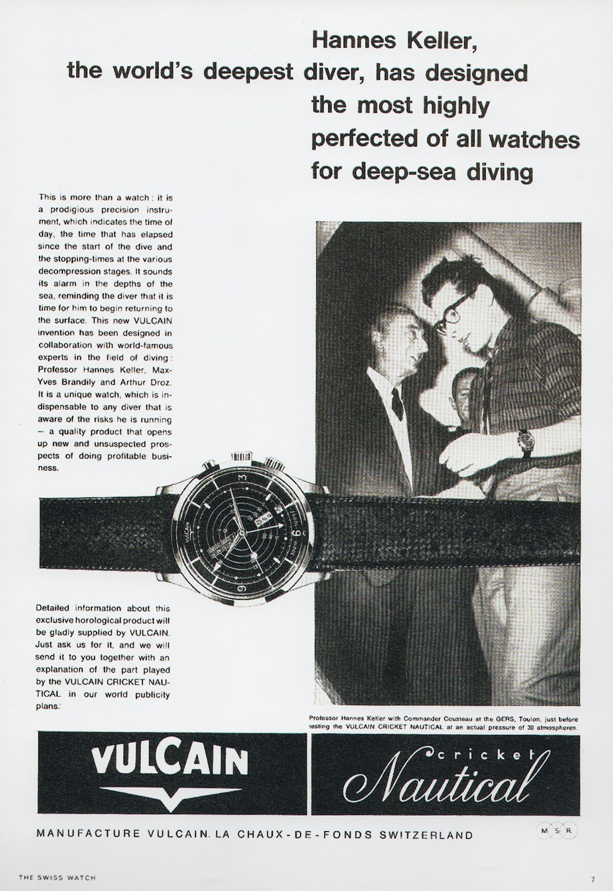 As we’ve explained in a recent article about the classic version of this watch, contrary to popular belief, sound travels well underwater. As such, with the advent of pro and amateur diving in the late 1950s, the alarm movement would become a rather practical safety feature for divers who wanted not only to track their diving times and signal when it was time to re-surface. While the concept of an alarm dive watch was first created by Jaeger-LeCoultre, with the Memovox Deep Sea in 1959, Vulcain, one of the main specialists of this chiming function (since 1947 and the Cricket watch) came close second in 1961 with the Cricket Nautical, equipped with a “triple case back” that acted as a resonance chamber, to amplify the sound underwater.