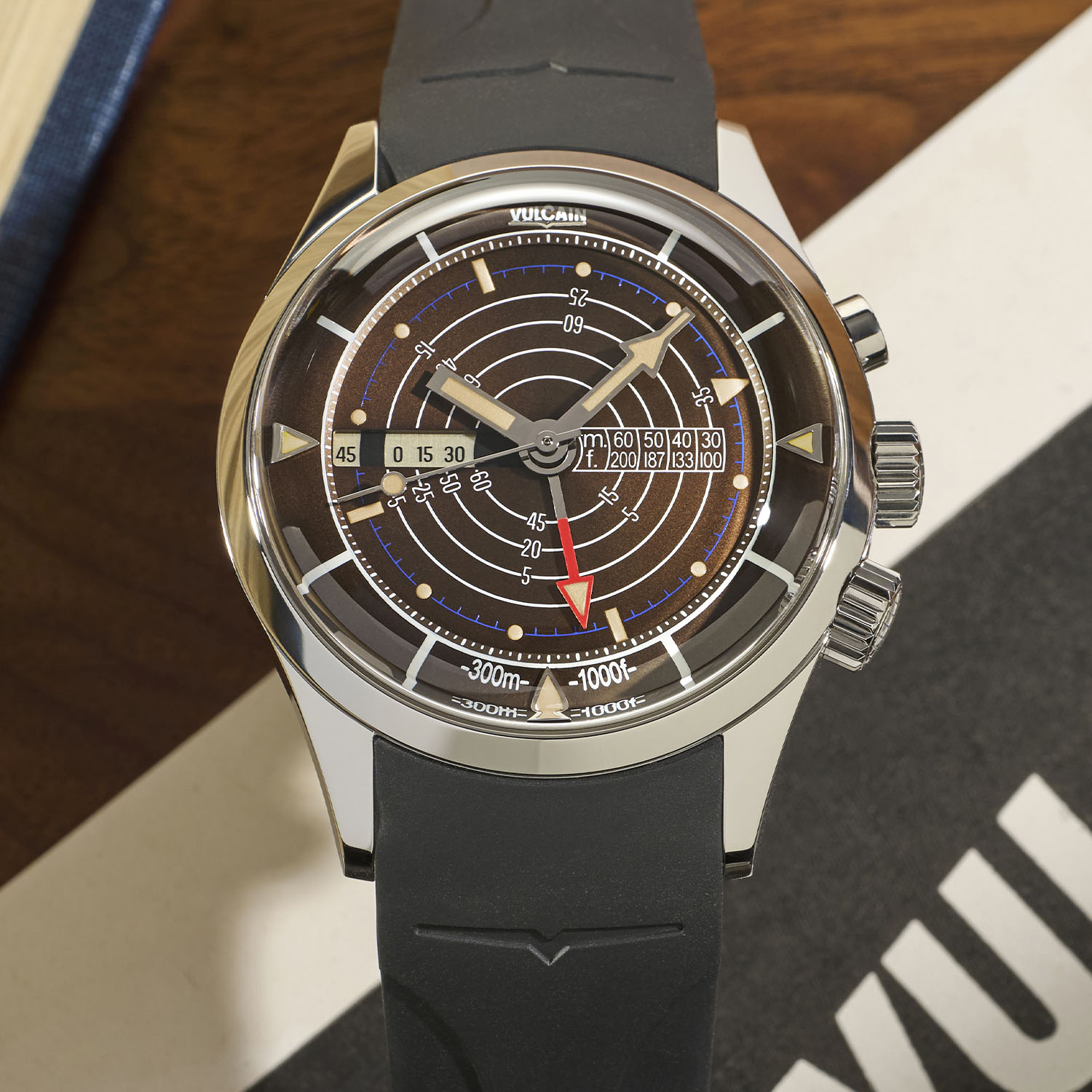 In addition to the time, the diving bezel and alarm function, the Vulcain Nautical Legacy features a rotating dial (used with the 4 o’clock crown) acting as a decompression table, an invention of the Hannes Keller team revealed through an aperture on the dial. Once set correctly (knowing the length and depth of the intended dive), this scale shows the diver for how many minutes they must stop at nine, six, and three meters before returning to the surface – we have explained in detail how this watch works in this article.