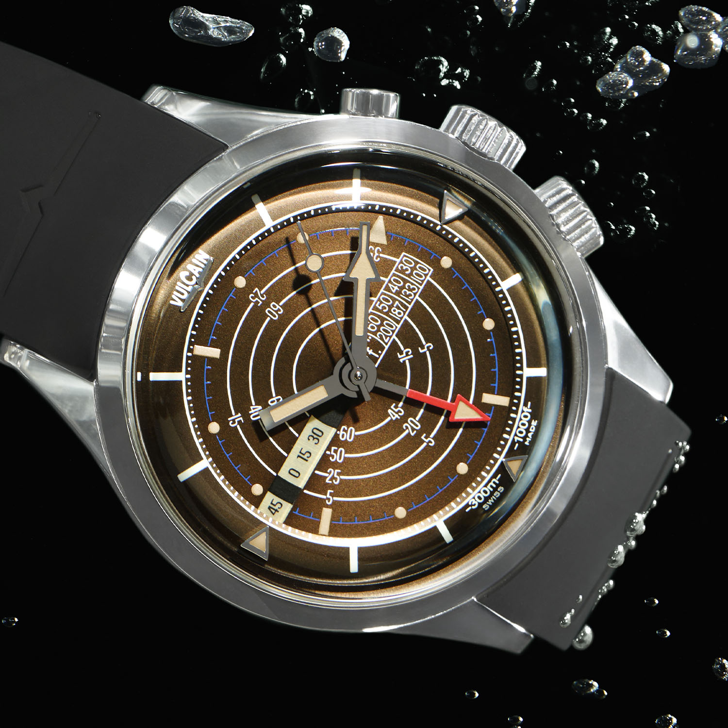 Massena’s work is mostly visible on the dial of what’s here named the Vulcain Nautical Legacy. This means that the technical base remains unchanged – as is often the case with watches done in collaboration with this design studio. It thus starts with a rather sizeable case of 42mm, made of stainless steel, and using an atypical three-crown/pusher layout – a crown for the movement, a pusher for the alarm and a crown for the rotating dial. Considering the combination of 300m diving capacities and the presence of a closed “triple case back” acting as a resonance chamber and allowing for the alarm to be loud enough to be heard underwater, plus the presence of an ultra-domed sapphire crystal on top, the Nautical Legacy isn’t thin… Thickness is measured at 17.5mm, just like the classic re-edition and also faithful to the proportions of the historical model.