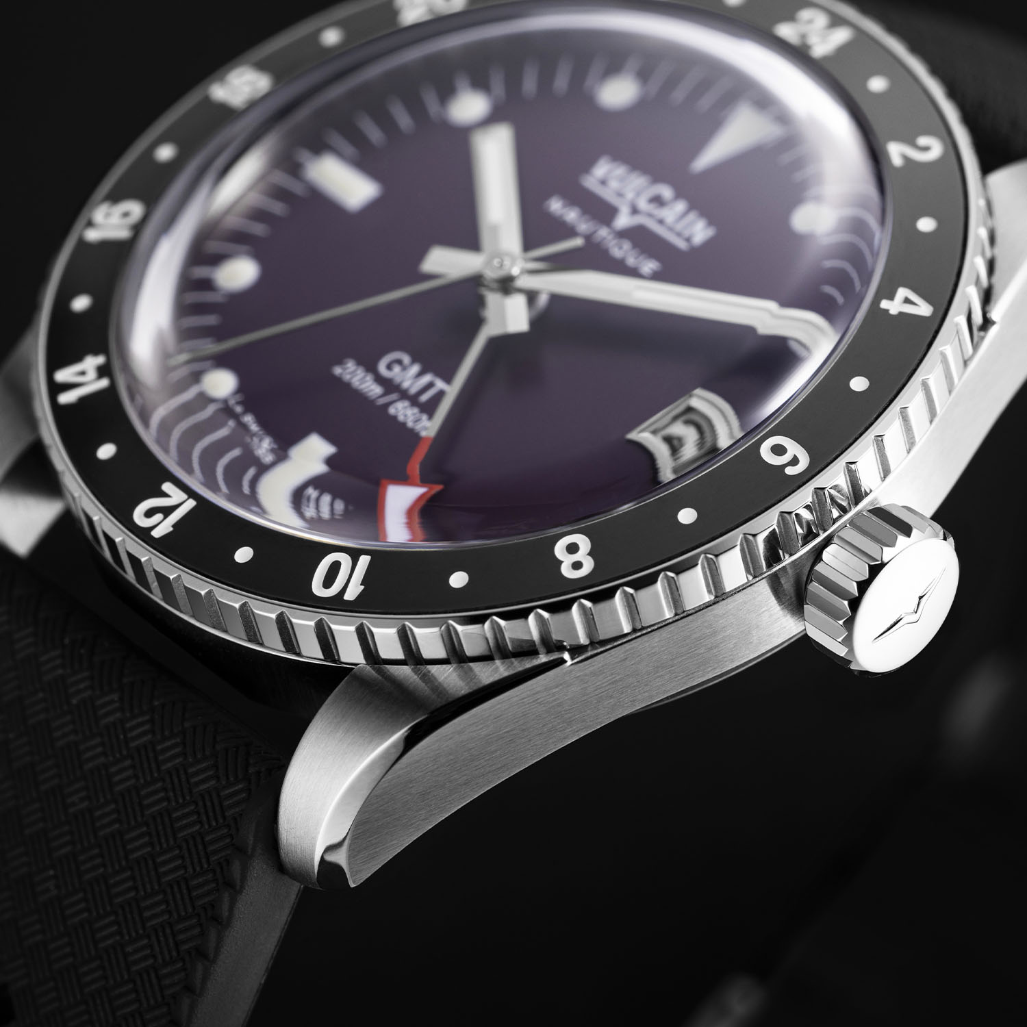 It’s rather surprising to see that the combination of diving credentials with a traveller’s function has only recently spread across the industry. While being undoubtedly very practical, there aren’t dozens of alternatives around, but let me give you some recent introductions in a fairly accessible price range: the Seiko 1968 Heritage SPB519, the Longines HydroConquest GMT, the Doxa SUB 250T GMT, the Hamilton Khaki Navy Scuba Auto GMT, the Certina DS Action GMT, the Mido Ocean Star GMT and, if you increase a bit the budget, the Tudor Black Bay 58 GMT. Recently, Vulcain expanded its Skindiver Nautique collection by adding a GMT complication, while retaining its diving capacities. And now, to make it even cooler, there’s this matte purple edition.