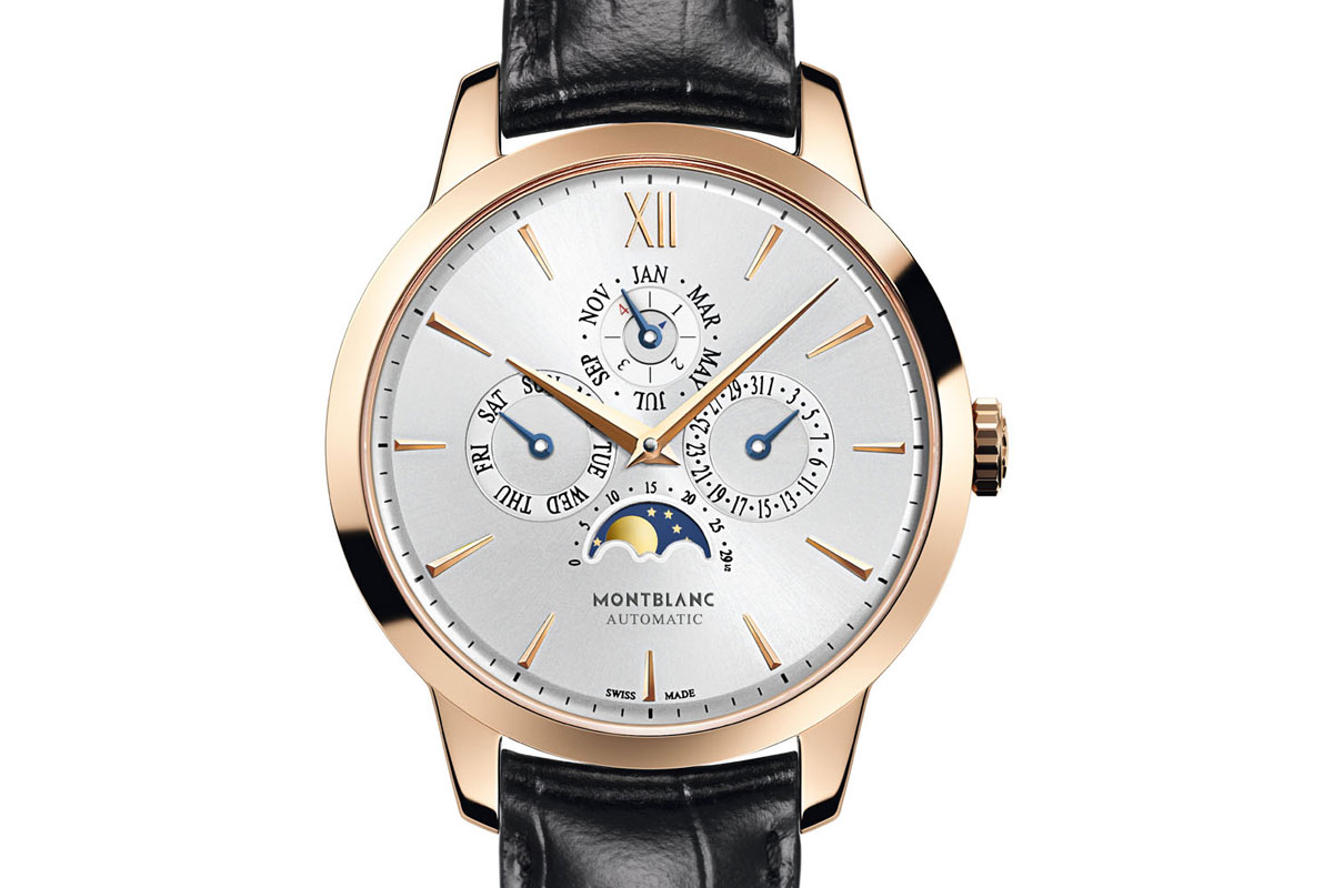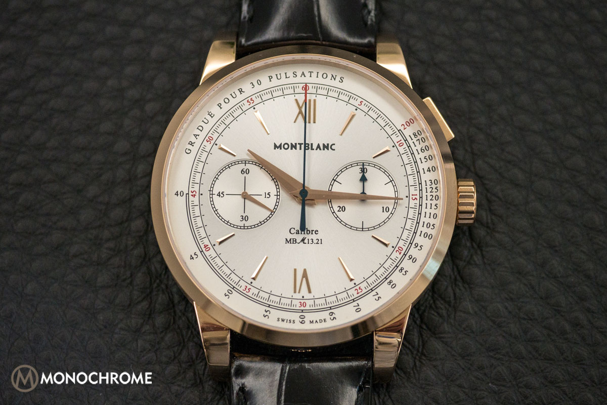 - Montblanc Montblanc Meisterstück Heritage Pulsograph: this one could very well be selected for its movement only: a vintage manual Minerva calibre, with one of the most beautiful layouts and finishes, activated by a mono-pusher. Well, the design and the feeling on the wrist are also stunning. A very successful watch (be fast, it is limited to 90 pieces and likely to be sold out. Other watches use the same movement in the Villeret Collection). Price: 27,000 euros.