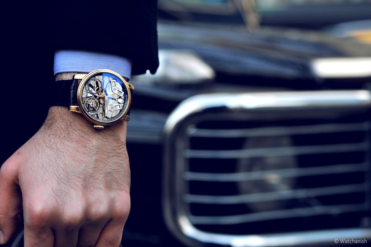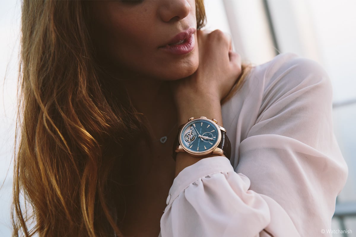 The second watch of this report is certainly one (if not the) most impressive of the Arnold and Son collection: the Arnold & Son Royal TEC1 – Technically Advanced Tourbillon Chronograph. The TEC1 is simply a chronograph with column wheel, with a self-winding mechanism and regulated by a tourbillon. Not bad at all! Especially when you consider that it is priced just under $100k, it is quite a bang for the buck. The Anorld and Son TEC1 has a warm colour scheme, with its anthracite dial and 18k red gold case, and a stylish design that emphasizes the tourbillon at 12 and that gives the watch a superb three-dimensional look. And, by the way, don’t you think it looks gorgeous on a lady’s wrist?