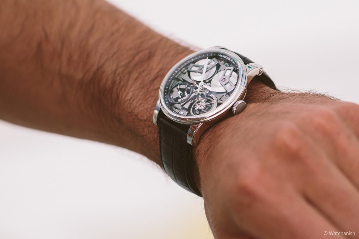 The Arnold and Son TB88 is really an appealing timepiece. Usually, skeletonized watches are, let’s say, loaded and not always very elegant. Some of them are of course pure mechanical art, such as the Armin Strom One Week Skeleton or the Roger Dubuis Skeleton Flying Tourbillon. The reason for that beauty is quite simple, and it is the same for this TB88: a movement designed from the beginning as a skeletonized engine. Some of the skeleton watches relies on existing movements that have been reworked to remove material from the bridges. And because those watches usually come with old-fashioned engravings, the result is not always very attractive or at least, not contemporary. Here, Arnold and Son brings a modern and technical vision of the skeletonized watch, with a unique goal: showing the mechanics. The result is pure, not showy and very well balanced. And the finish of the elements that composed the calibre is superb.