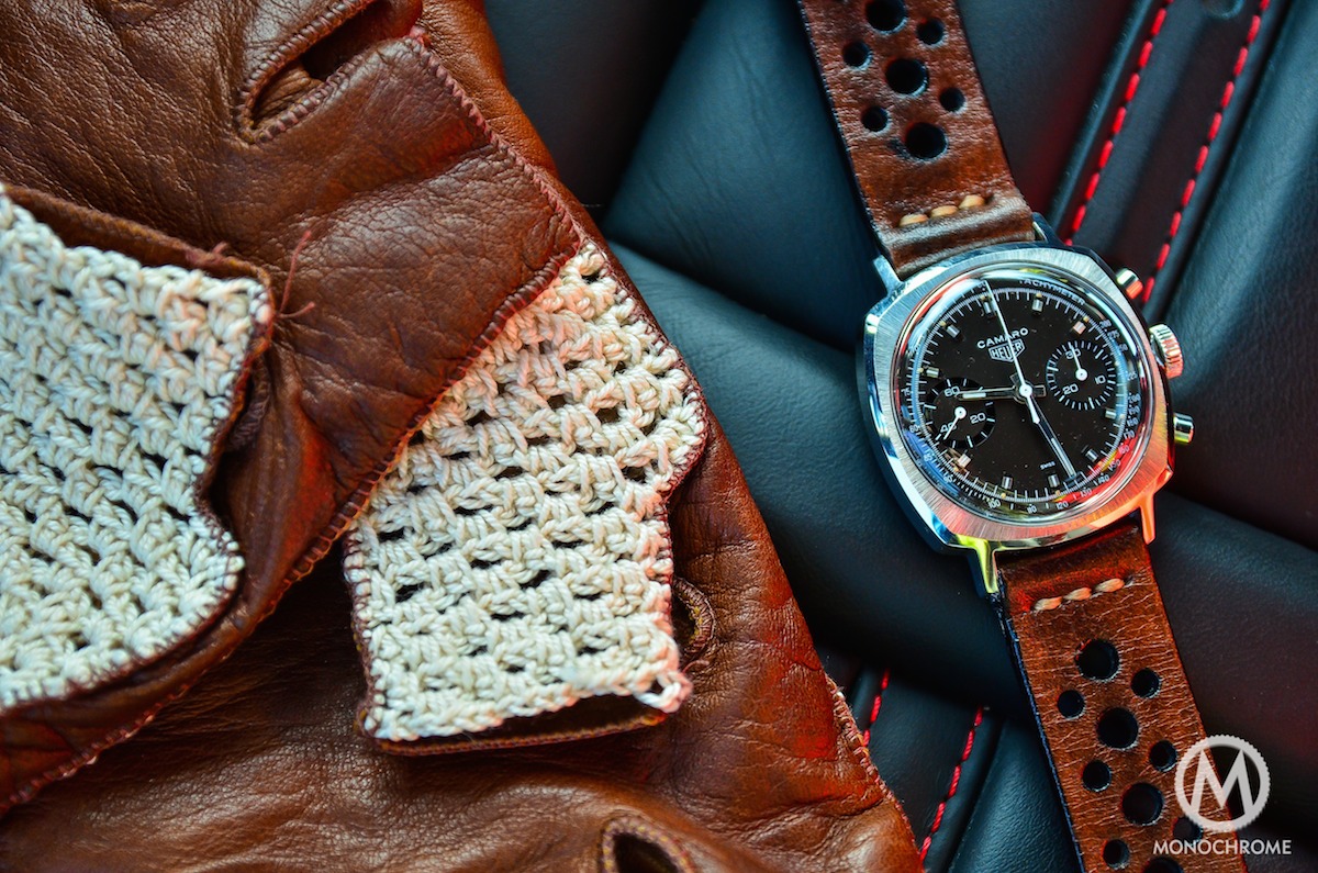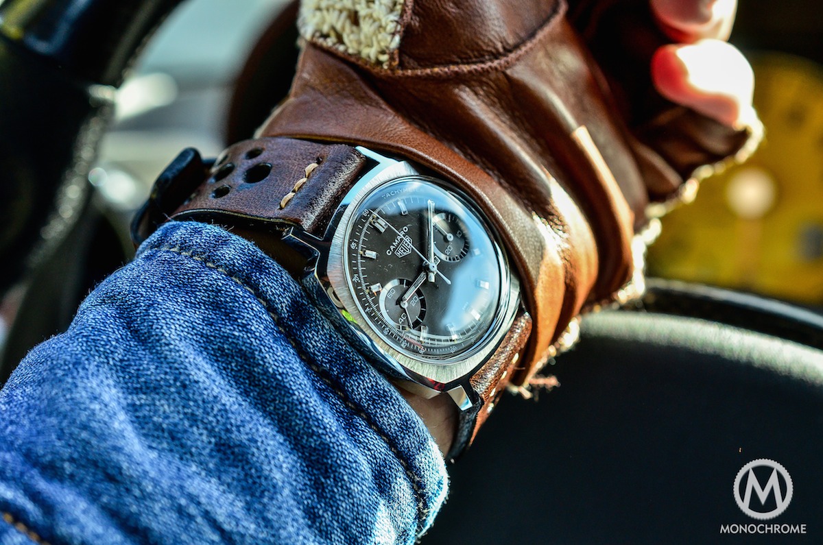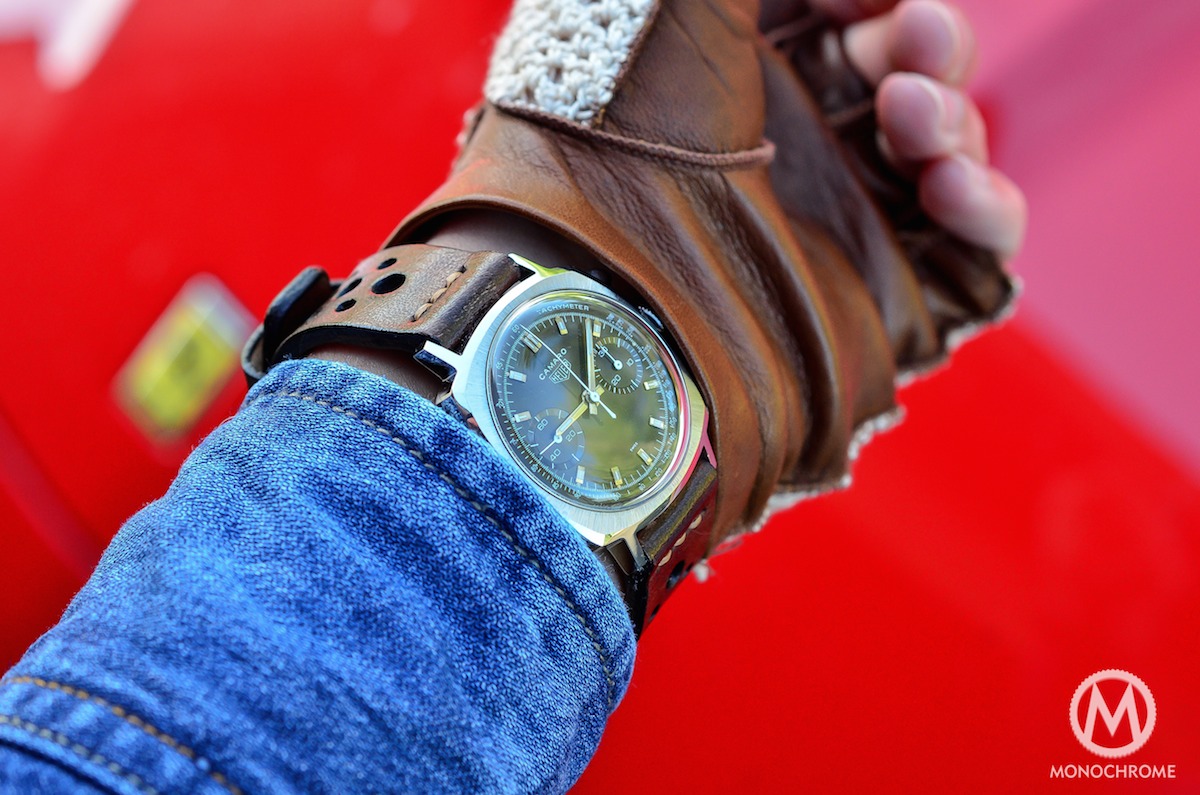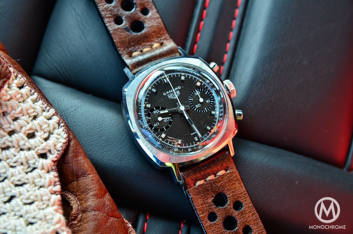 Many editions were available: black or white dial – it even came with ‘panda’ dials, one of the most collectible nowadays; Bi-Compax or Tri-Compax display – meaning with or without a 12 hours sub-dial at 6; and a choice of 3 different movements – Valjoux 92, Valjoux 72 (same as the old Rolex Daytona) or Valjoux 7730. The main difference from the Carrera is the Camaro’s cushion-shaped case that shows off multiple finishes – polished sides, bevelled angles and sunray pattern on the top. And since the whole design reminds us of racing instruments, what could be better than a Rally Strap to fit the Camaro?