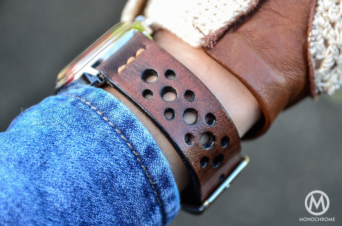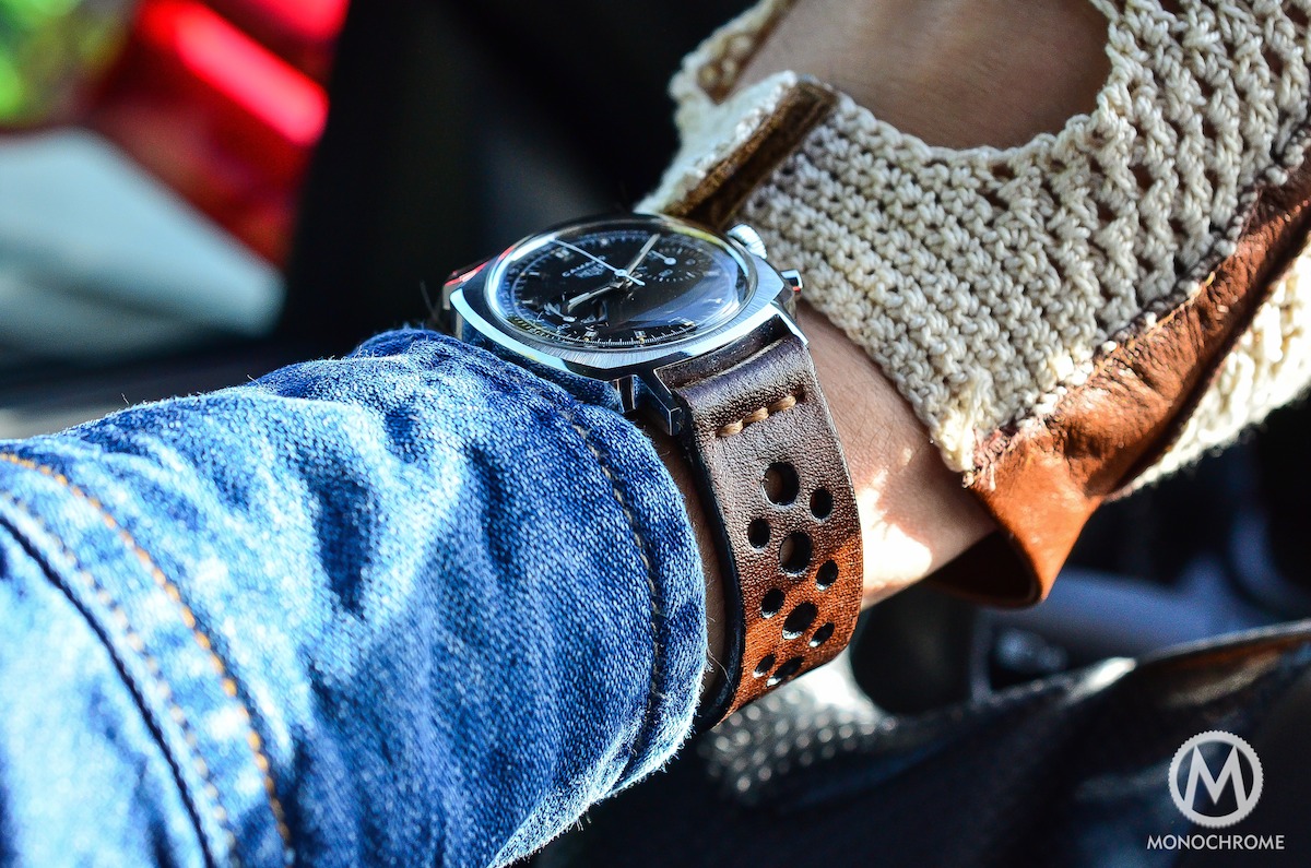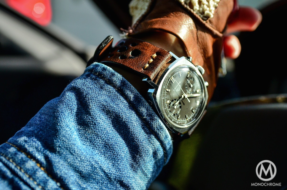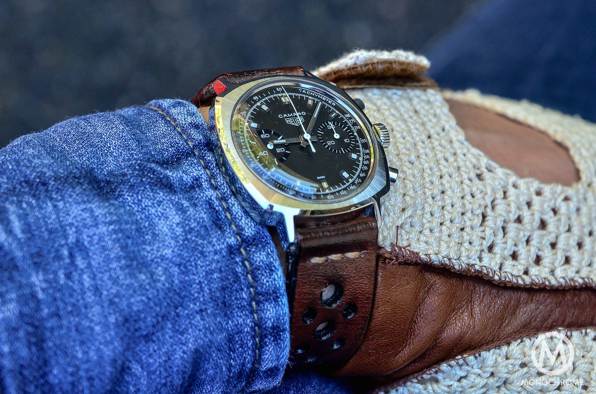Many editions were available: black or white dial – it even came with ‘panda’ dials, one of the most collectible nowadays; Bi-Compax or Tri-Compax display – meaning with or without a 12 hours sub-dial at 6; and a choice of 3 different movements – Valjoux 92, Valjoux 72 (same as the old Rolex Daytona) or Valjoux 7730. The main difference from the Carrera is the Camaro’s cushion-shaped case that shows off multiple finishes – polished sides, bevelled angles and sunray pattern on the top. And since the whole design reminds us of racing instruments, what could be better than a Rally Strap to fit the Camaro?